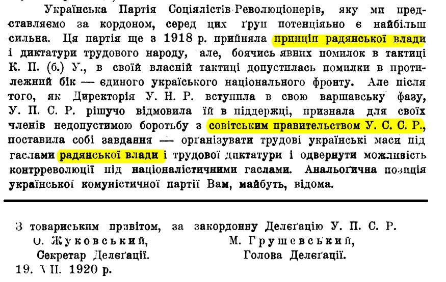 Історик Геннадій Єфіменко знайшов цікавий документ за 1920 рік. УНР ще існує, боротьба триває, армія остаточно не склала зброю, готується всеукраїнське повстання проти російських більшовиків, але голова Української Центральної Ради Михайло Грушевський, який сам перебуває в еміграції у Відні, відмовляє їй у підтримці і озвучує прийняття "радянської влади і диктатури трудового народу".