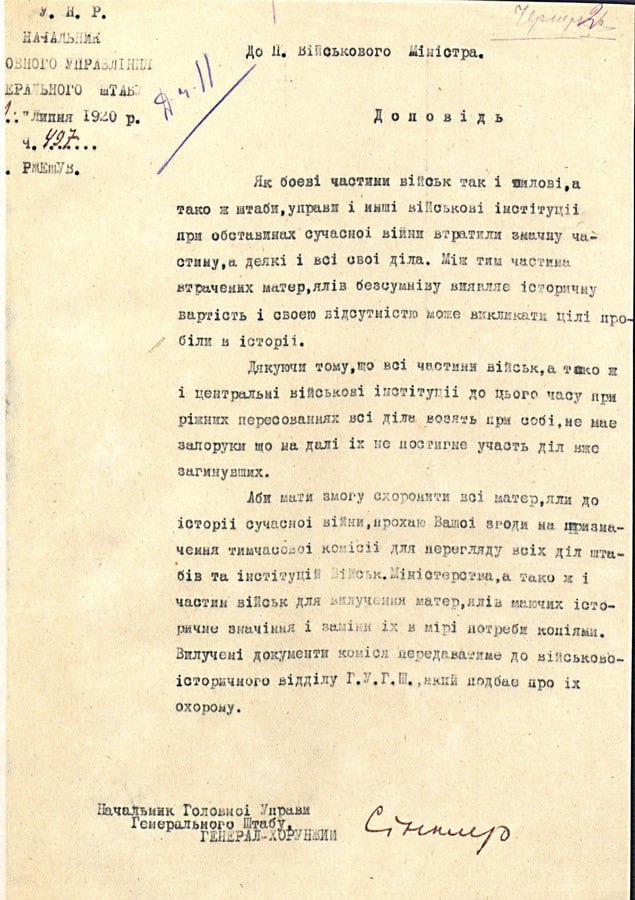 Доповідь Начальника Головного управління Генерального штабу В. Сінклера Міністру військових справ УНР про необхідність створення тимчасової комісії для збору документів військових частин, які мають історичне значення. 21 липня 1920р.