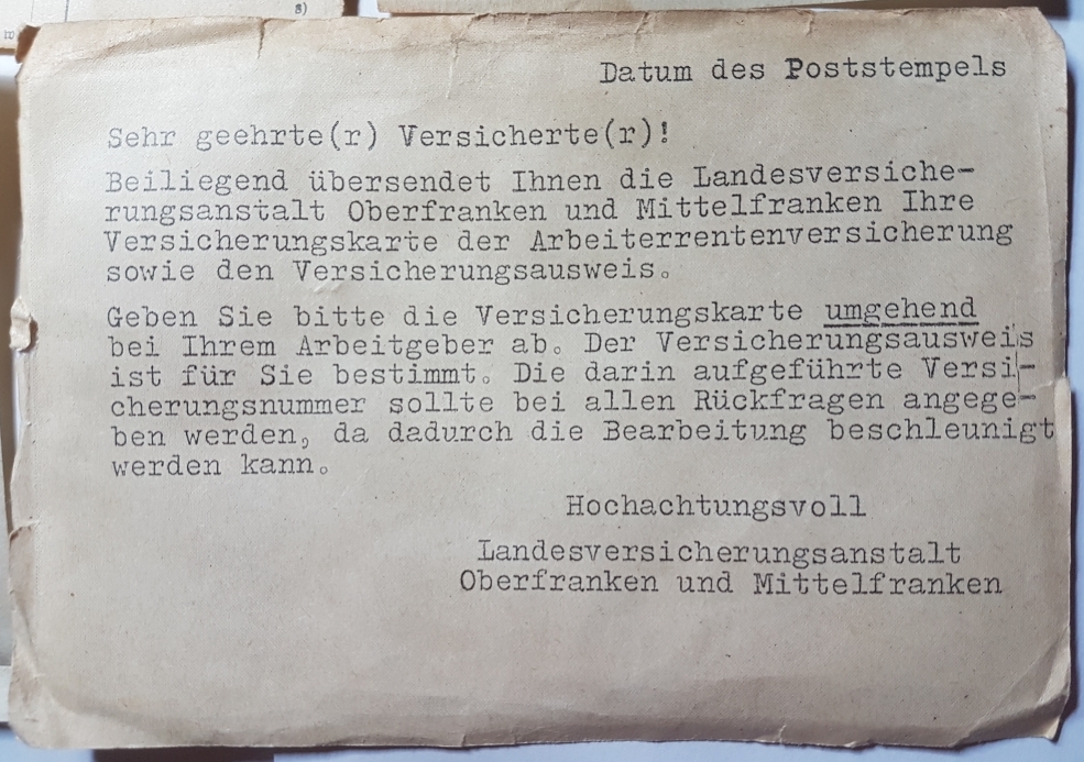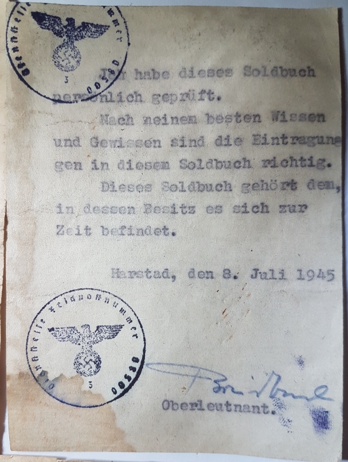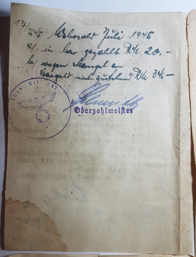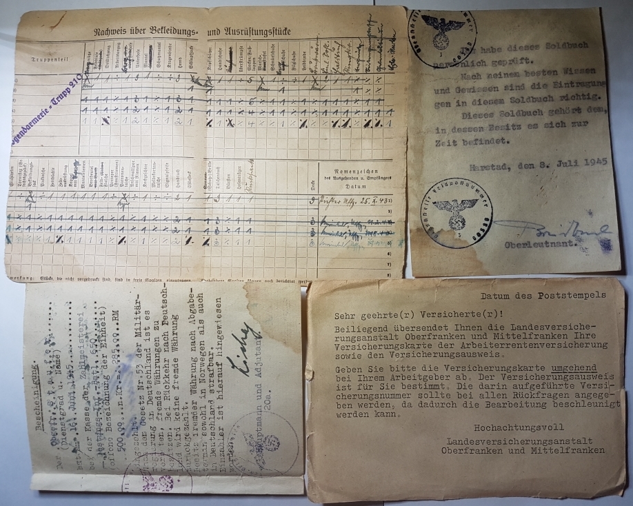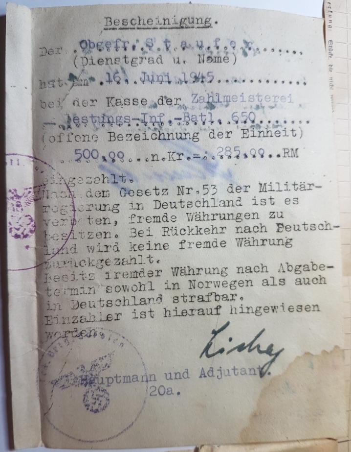 Третья - карта выдачи казенных вещей жандармской группе 210. Трусы, носки, шинели, головные уборы, портупеи, вот это все. Четвертая - цiкава вещь, с подвывертом, почти анекдот. Справка о том, что старший ефрейтор Штауфер сдал (добровольно-ли?) в полковую кассу 650-ого пехотного батальона 500 норвежских крон. Законом рейха запрещается иметь на территории рейха иностранные валюты. Поэтому солдатам запрещено при возвращении в Германию, а так-же находясь в Норвегии, иметь при себе любую валюту. Ефрейтора об этом преступлении крепко и настоятельно предупредили. Сданая валюта возврату и обмену не подлежит. Пятая -туфта. Дорогой застрахованый, с этим письмом высылаем вам ваш ИНН и страховую карточку. Сообщите ваш ИНН работодателю. Страховая карточка для вас, носите ее с собой. Ваша государственная страховая компания. Последнюю рукопись разобрать не удалось.