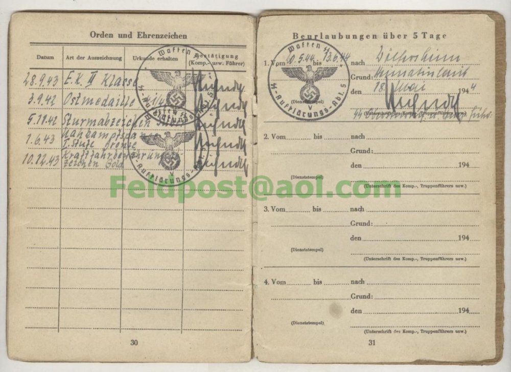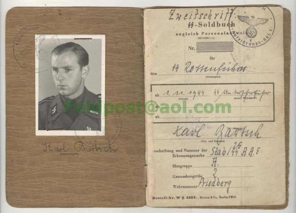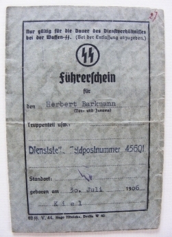 Водительские права на Pte. Barkmann. Служил с 1944 в SS - Nachsch. Tr. 5 (5-ой автоколонне обеспечения 5. SS - Pz. Div. "Wiking"). Формирование обслуживало Викингов с октября 44 по май 45 на Запад (Польша-Модлин, Венгрия, Австрия-Грац).