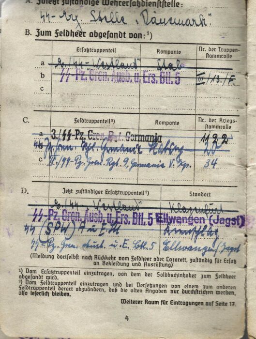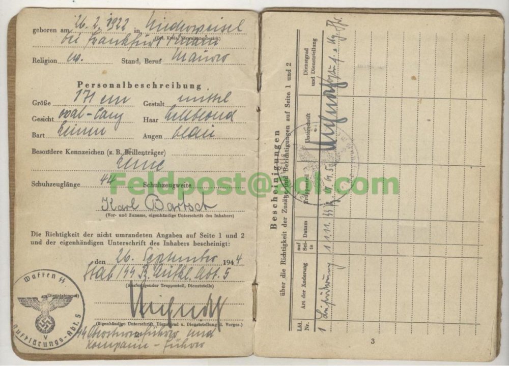 Очередной зольдбух... 5-й разведбатальон дивизии Викинг. SS-Aufklärungs-Abteilung 5 (SS Reconnaissance Battalion 5) of the 5. SS Panzer Division "Wiking." Владелец. SS-Unterscharführer Karl Bartsch Зольдбух повторный. Интересная запись о выдаче ему трофейного итальянского пистолета-пулетемета Беретты 38.