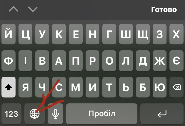 Якщо є такий глобус,є сенс понатискати на нього,він міняю мову вводу. 609E8479-4D44-42D2-A878-64A828DEE5E0.jpeg