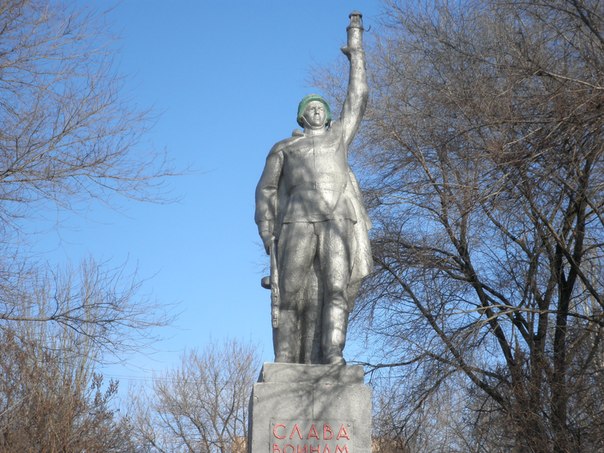 А это памятник Воинам-шахтёрам,в одной руке солдат держит папашу,а в другой,высоко над головой-шахтёрскую лампу.На сайте города он учтён (как не нужный),а фотографию что то не найти.Да и памятник интересный,думаю именно такого нигде нет,только маляр хреновый был......каска зелёная а памятник серебряный......(хотя всё логично,памятники должны быть все серебряные а каски зелёные и не в коем случае нельзя нарушать эту гармонию )