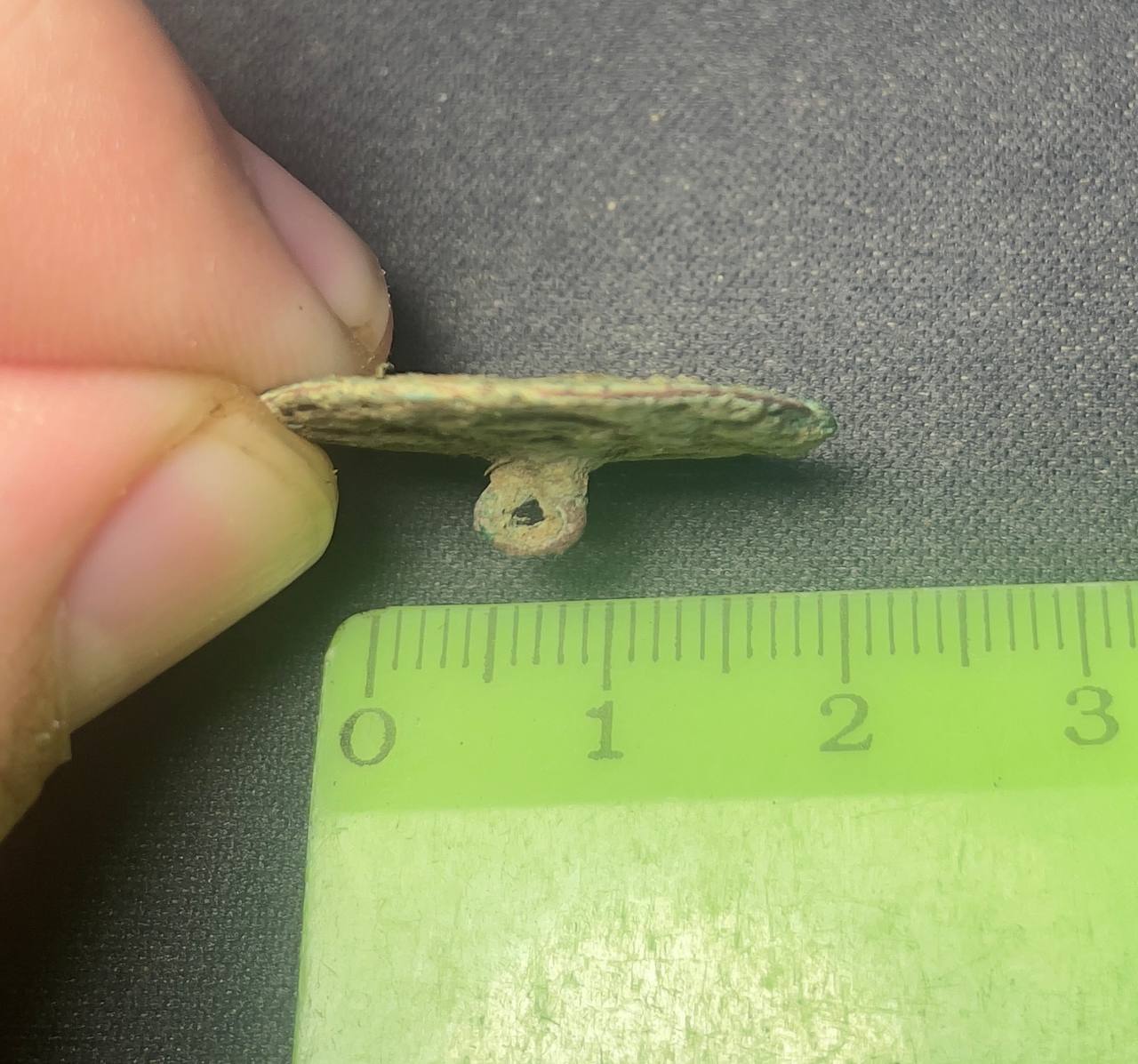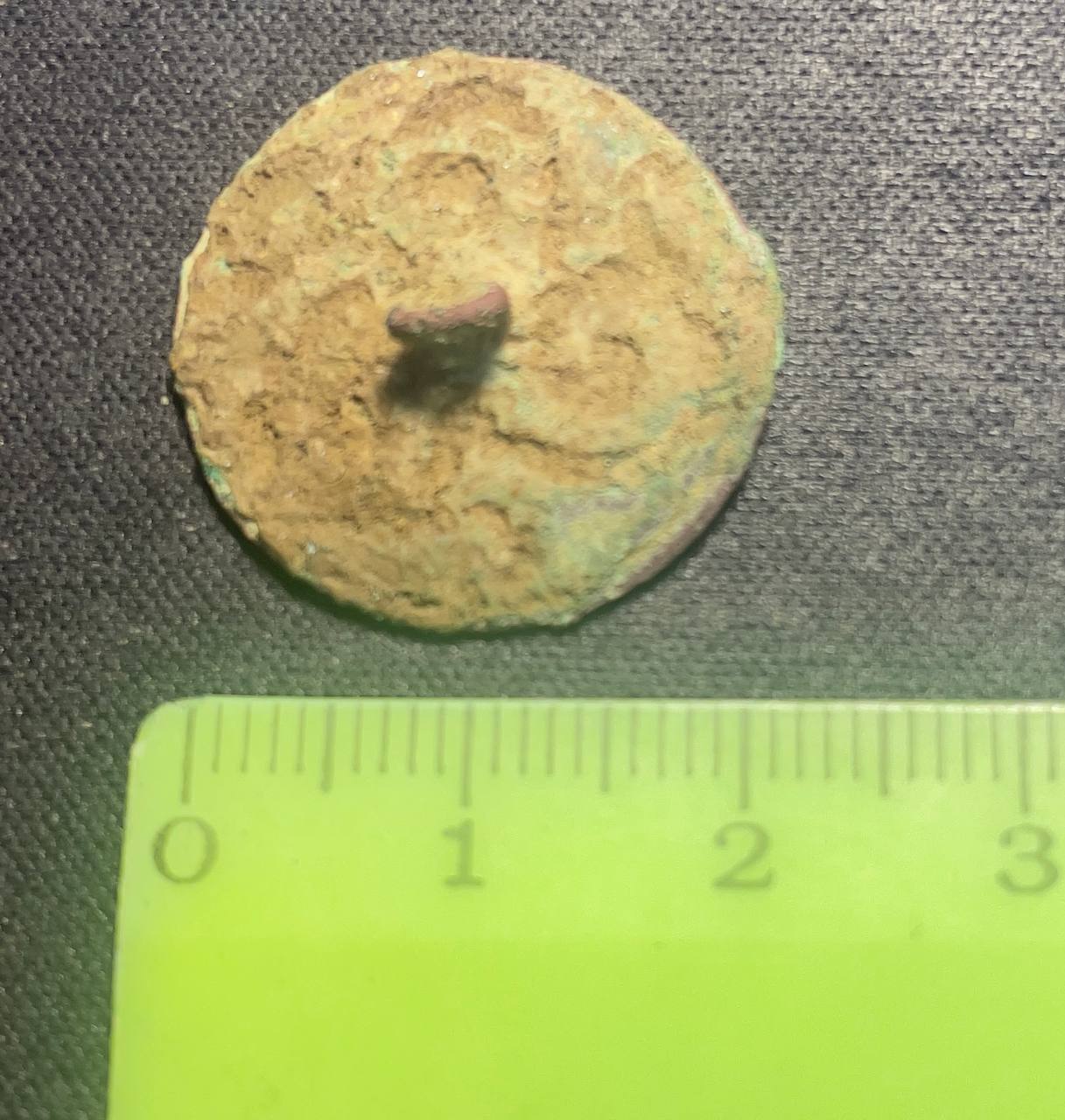 Сьогодні під час копу знайшов плоский тонкий гудзик, матеріал — мідь (або мідний сплав). На лицевій стороні проглядається візерунок, схожий на трилисник (клевер). Тонкий, форма майже ідеально кругла. Зворотня сторона з маленьким вушком.
