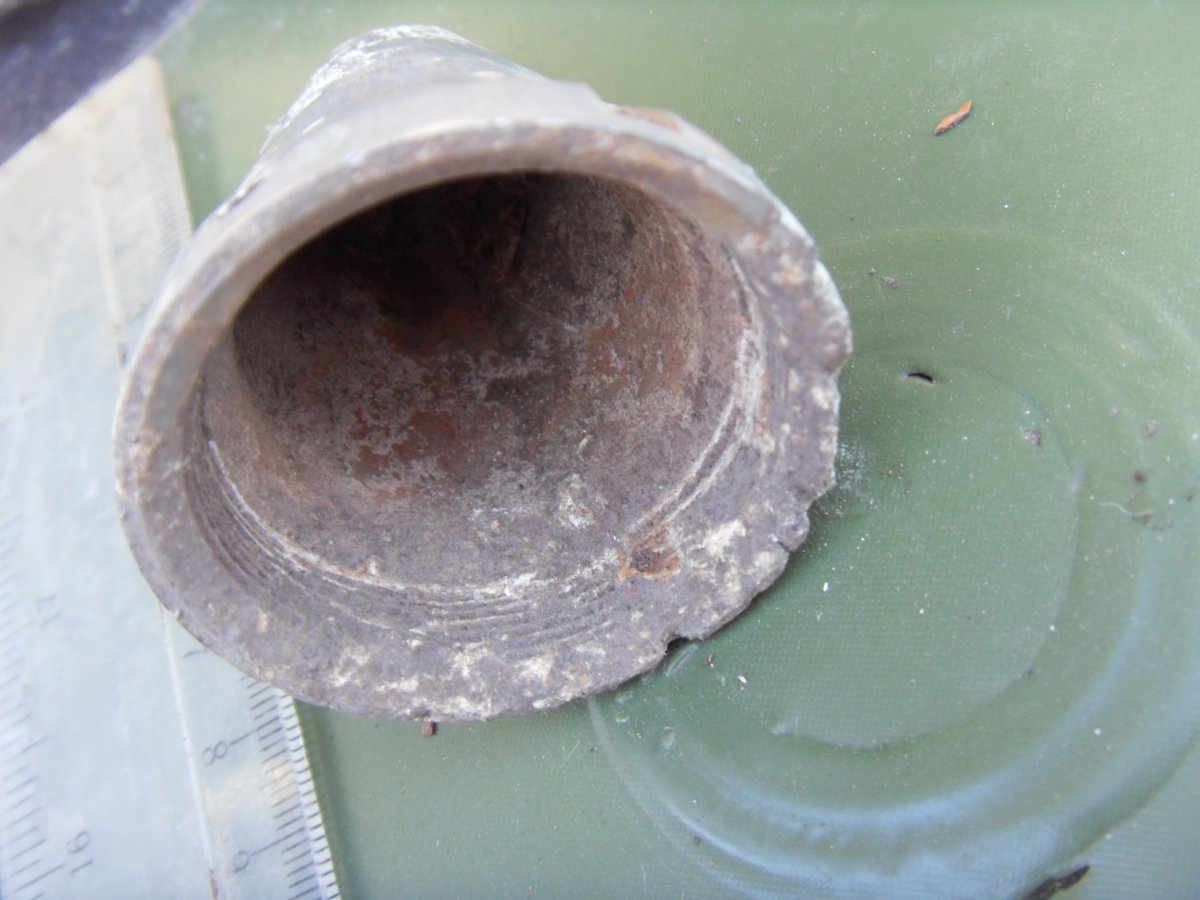 Калибр "не характерный" для РСов времен ВМВ - 220-мм. Да у немцев был реактивный миномет в таком калибре - 21cm Nebelwerfer 42, но головная часть РСа там выглядит совершенно по другому. Лично мне кажется, что это остатки корпуса советской зажигательной АБ ЗАБ-50тг (либо ЗАБ-50фп)...Что это и с чем их "ели" есть информация в инете. Ну тут один нюанс. В наших справочниках указан диамет корпуса 203-мм, а вот пендосовский справочник дает 8,5 дюймов, что есть 216 мм. Не претендую на истину в последней инстанции..Вы можете ТОЧНО замерить диаметр ОЧИЩЕННОГО корпуса чуть ниже первого стыка сверху?