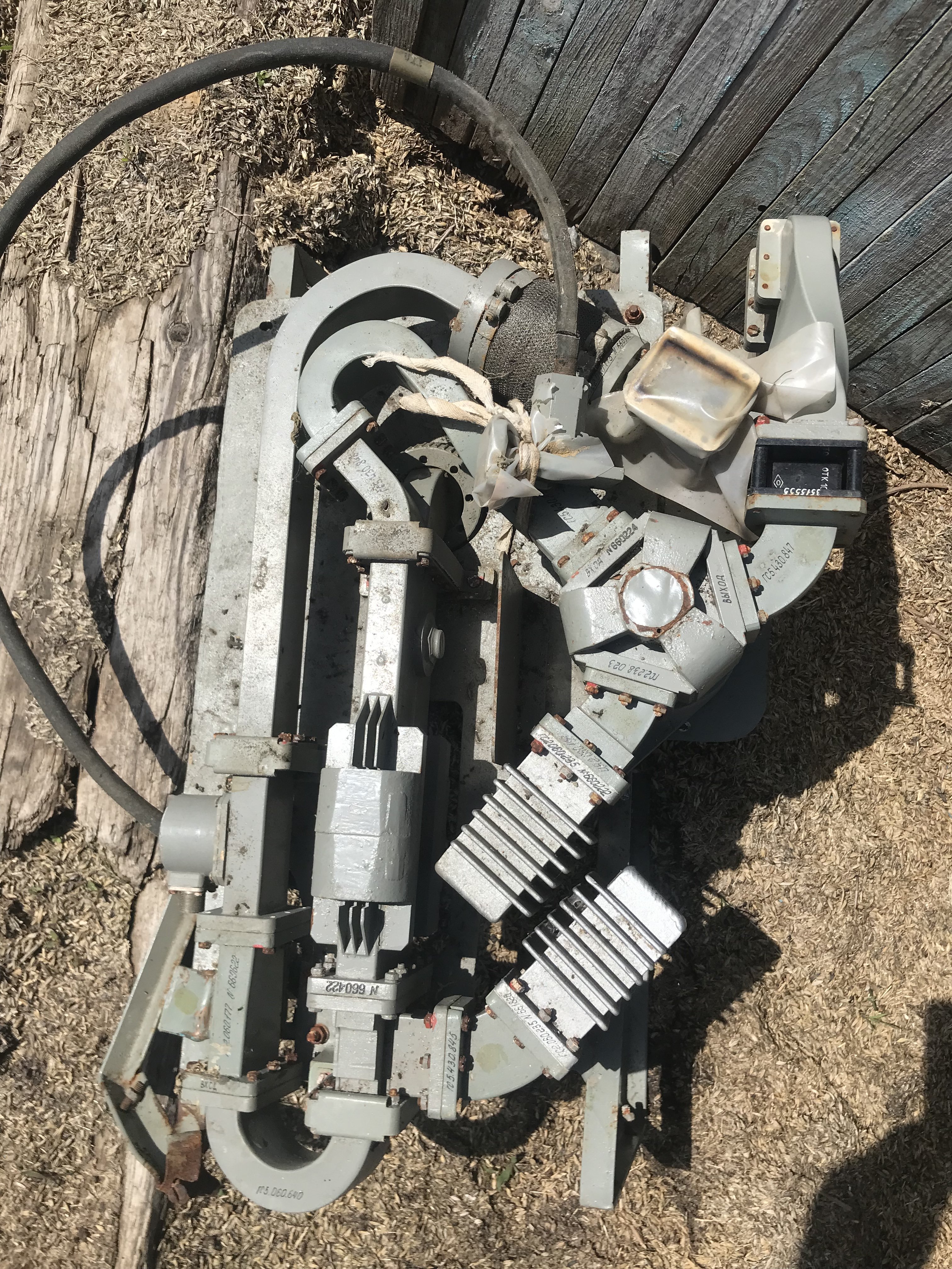 Согласен с предыдущими ответами. Часть волноводного СВЧ тракта. Скорее всего передатчик (ребра охлаждения на волноводах). По маркировкам на деталях установить для какой техники это "железо" сложно. В интернете такую информацию найти практически нереально, но спрашивать нужно у специалистов ЗРВ, ПВО СВ, связистов или РЭБ.