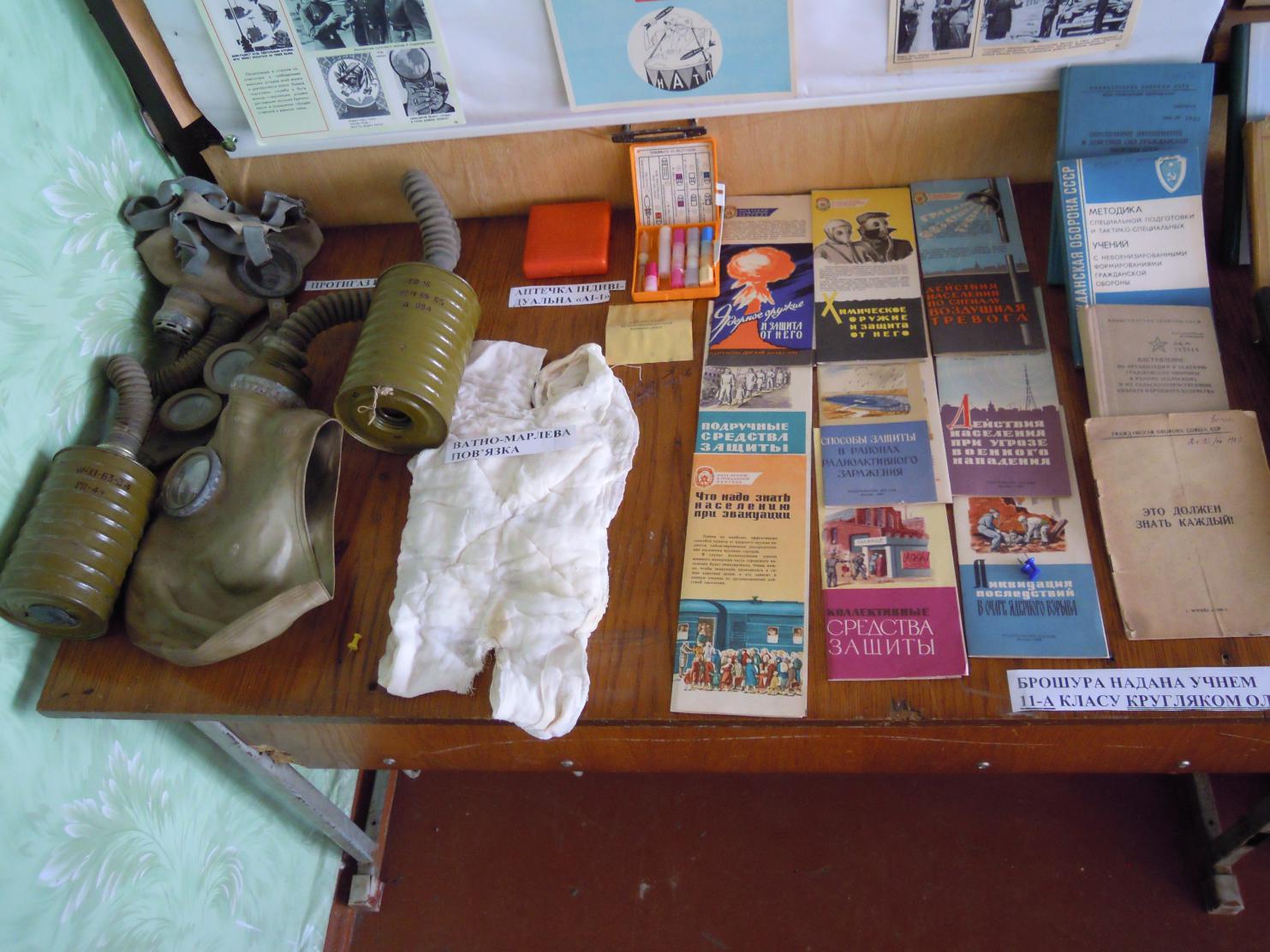 Радіоприймач компактний тогочасний на фоні лого БіБіСі. Голова манекена у ватно-марлевій повязці й список сигналів ГО, індивідуальні аптечки. Значки ГТО.