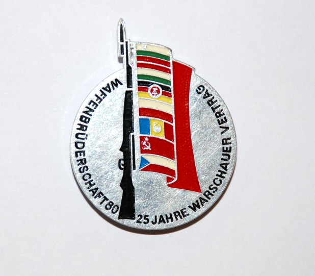 Здравствуйте. Могу предложить фото значка 25 лет Варшавскому паку (как-то так на немецком написано) там винтовка и флаги стран участниц Варшавского пакта. Для того периода стильный…. такая своеобразная агитка... Если надо то попробую на завтра сфотографировать, где то дома лежит….