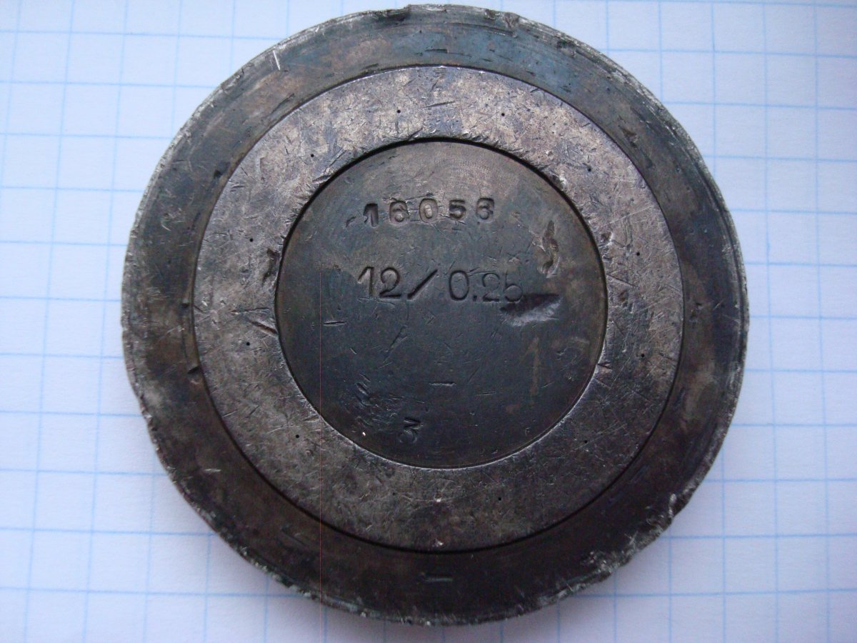 Доброго часу,шановні! Може підскаже хтось по предмету?! Шайба знайдена на позиціях ДСВ,на глибині-50-60см.Розмір-53*6мм,вага-110г,метал-невідомий,(не магніт.)без жодних ознак окисів,думав-срібло,але не воно. По всьому діаметру-конусні отвори. На кожній стороні-номер,мабудь деталь підзвітна. Які будуть бачення?