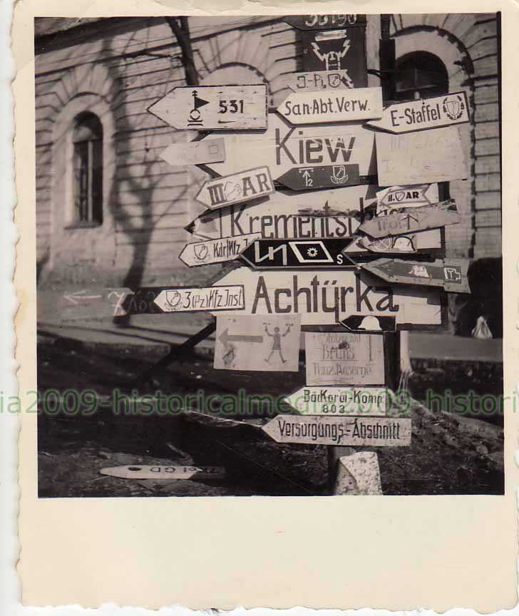 Солдат вермахта возле дорожных указателей в оккупированном Смоленске. За разрушенной постройкой видны купола Успенского собора.