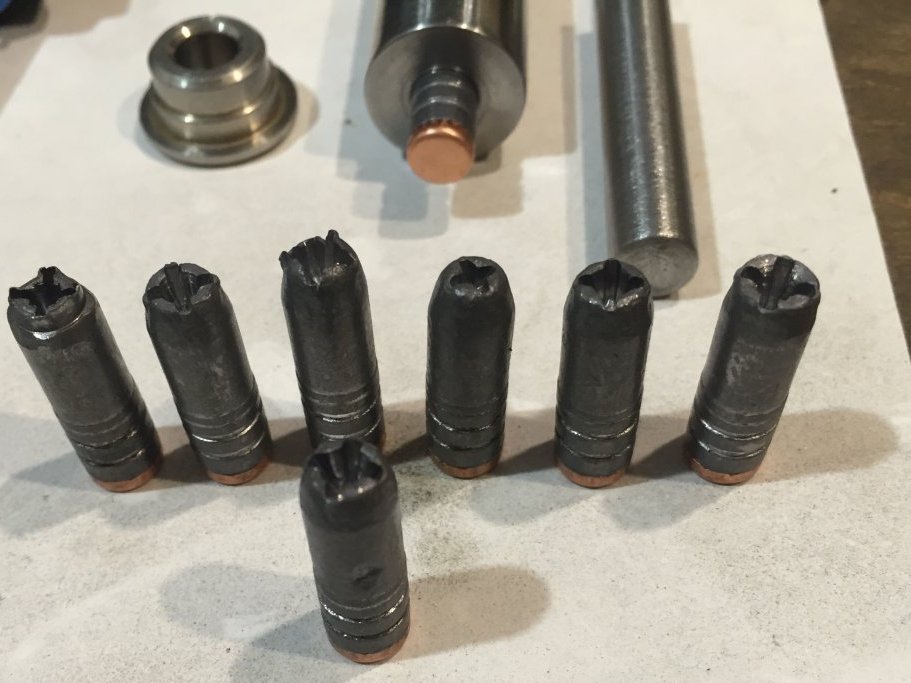 Свежий тест экспансивного раскрытия свинцовых пуль в калибре 308win весом 150 и 180 грейн на дозвуке скорость 330м/c, пули с экспансивной доработкой, дистанция стрельбы 50 метров, мишень - канистра 5 литров с водой. На фото пули рядом до и после выстрела.
