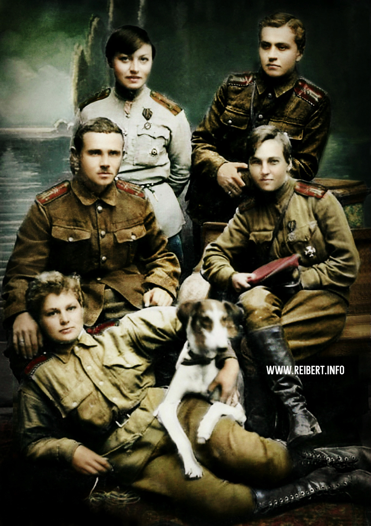 Перед эвакуацией из Крыма. Октябрь 1920г. Мужчины офицеры на фото: штабс-капитан Александр Митрофанович Бородаевский (1891–1968) и его брат Михаил Митрофанович (1900–1979) (стоит справа). Михаил Бородаевский до конца жизни жил в эмиграции во Франции, тогда как его старший брат, живший в Болгарии, в 1955 г. вернулся на родину. Рядом с братьями Бородаевскими две девушки — подпоручики Надежда Николаевна Заборская (сидит справа) и Зинаида Иосифовна Готгард (стоит слева), из знаменитого женского выпуска Александровского военного училища 1917 года, обе участницы Ледяного похода. Жизнь их в эмиграции сложилась трагически: и та, и другая застрелились (Готгард — в Югославии, Заборская — в Парагвае). На переднем плане, в обнимку с собакой, — Валентина Васильевна Лозовская.