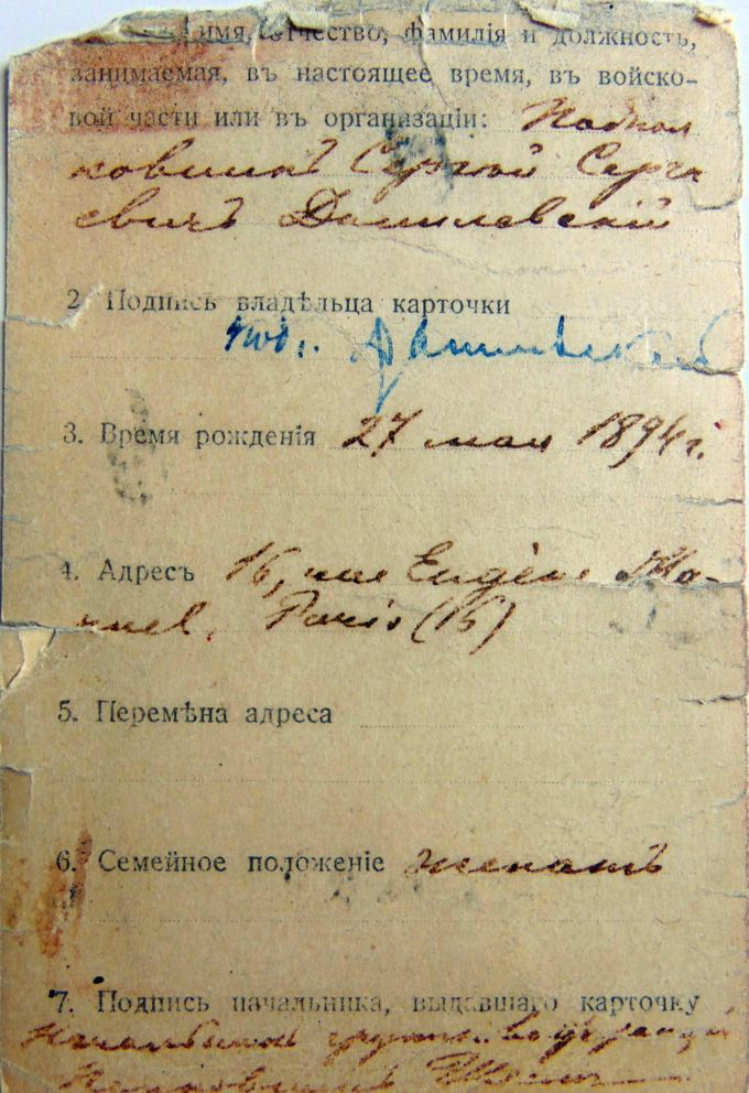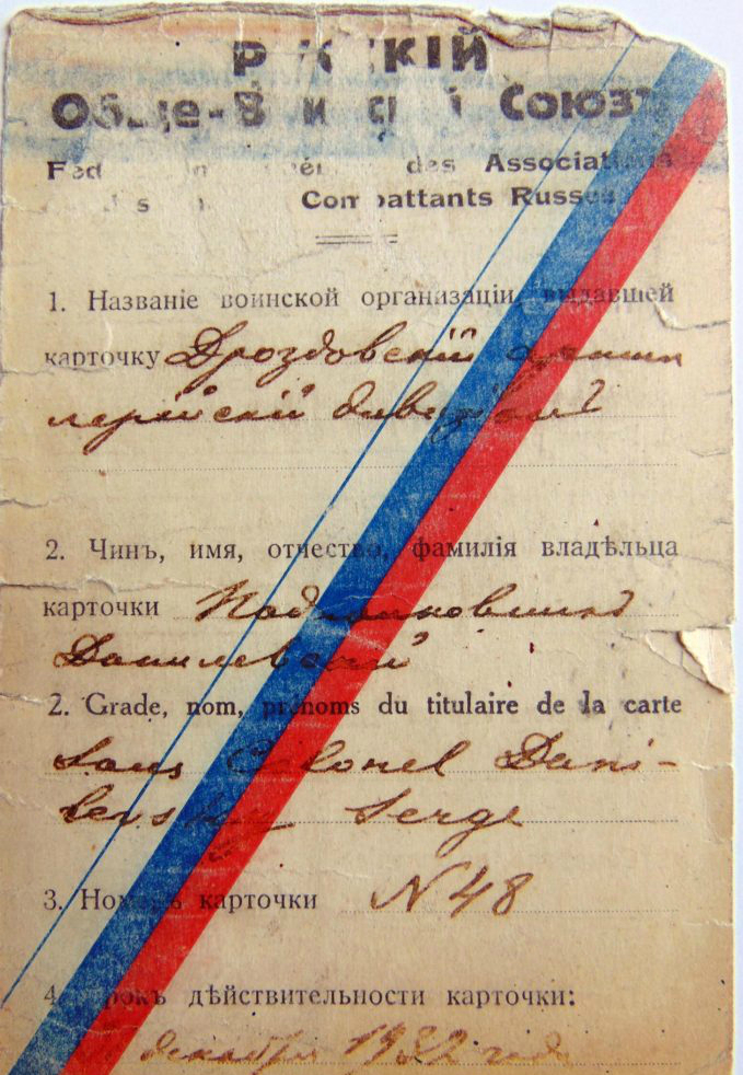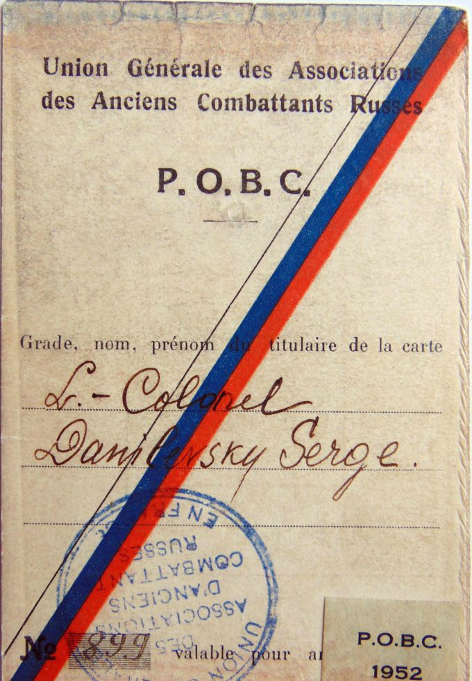 Послевоенное удостоверение РОВС подполковника Дроздовской артиллерийской бригады Данилевского С.С. Членские взносы уплачены на 1952 год.