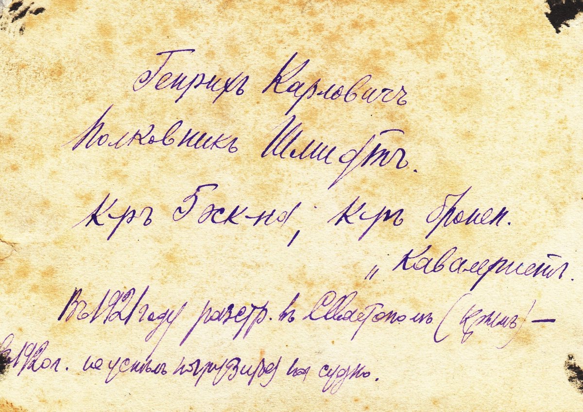 Офицер Кубанского казачьего войска полковник Генрих Карлович Шмидт. Командовал 5-м эскадроном в 2-м Офицерском генерала Дроздовского конном полку. Позднее командовал бронепоездом "Кавалерист". Полковник Шмидт в муравейнике Крымской эвакуации не успел погрузится на отходящий транспорт. Расстрелян большевиками. Фото подписано рукой полковника 2-го Офицерского генерала Дроздовского конного полка Дмитрия Алексеевича Силкина.