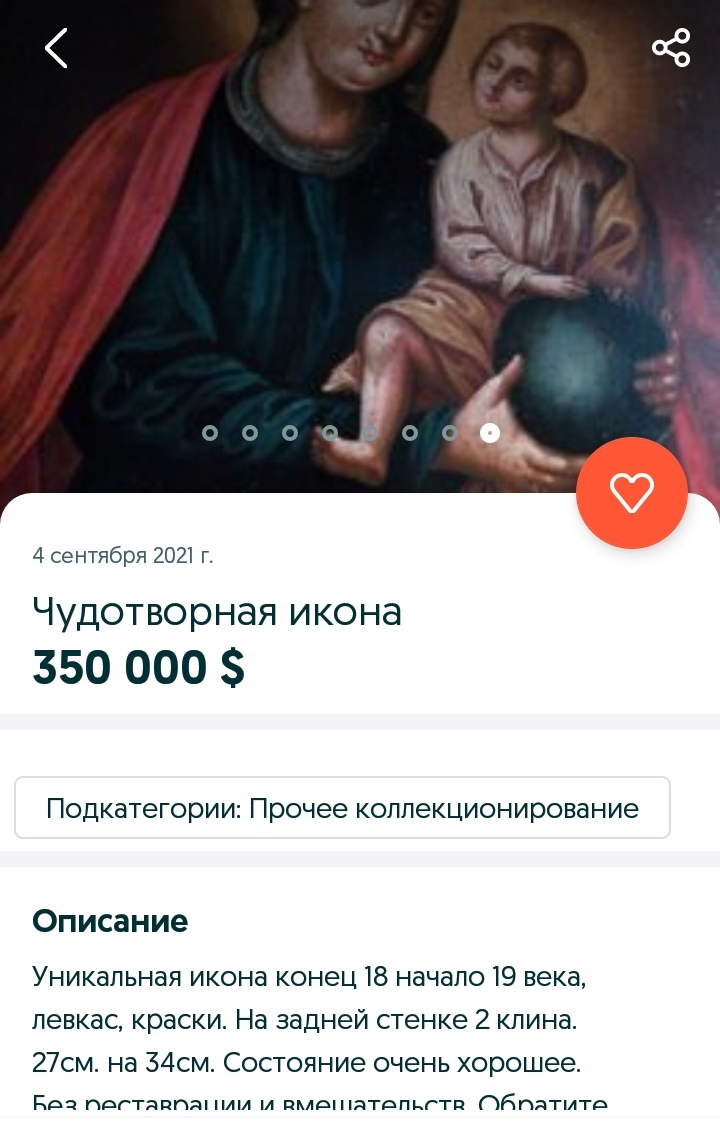 жесть.... Цинизму нет предела! Не реклама,а тупо шок .. Комментарии.... .. Уникальная икона конец 18 начало 19 века, левкас, краски. На задней стенке 2 клина. 27см. на 34см. Состояние очень хорошее. Без реставрации и вмешательств. Обратите внимание на ее покрытие головы и лица. Больше ни на каких иконах не встречается. Можно сказать, что в таком написании она является в одном экземпляре. Она написана очень талантливым иконописцем. Письмо очень тонкое и хорошее. Высокий уровень письма. Эта икона моей прабабушки. Чудотворная, намоленная церковью. Была подарена прадеду его другом. Он сказал, что она имеет исцеляющую силу. В то время бабушка сильно болела, много молилась возле этой иконы с верой и надеждой. Пришло исцеление и она выздоровела. Бабушка была верующим человеком. Пела в церковном хоре. Потом она отнесла икону в церковь и отдала священнику. И там происходили различные чудеса исцеления людей. Некоторые женщины, которые потеряли надежду иметь детей беременели и имели деток. Во время революции, когда началось гонение, рушили храмы, жгли иконы, бабушке чудом удалось спасти один образ. Она находилась в золоченом резном киоте. Икона была покрыта дорогой сребропозлащенной ризой. Киот был разбит, оклад сорвали, так как он был из чистого серебра и местами покрыт золотом. А икону бросили в кучу, хотели спалить. С тех пор она находится в нашей семье. Желающие помолиться возле этой иконы, молитесь верой и надеждой. Результат будет. Вы должны в это верить, потому что молитва без веры мертва. Ну, и конечно, не грешить. Она защитит ваш дом и ваших близких
