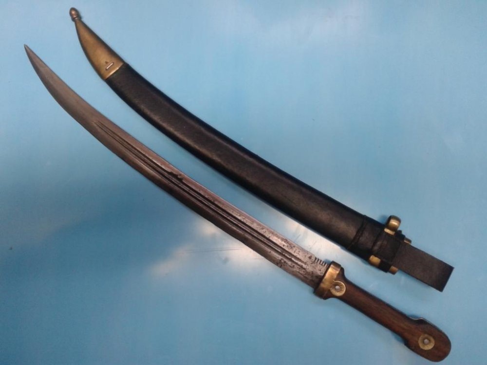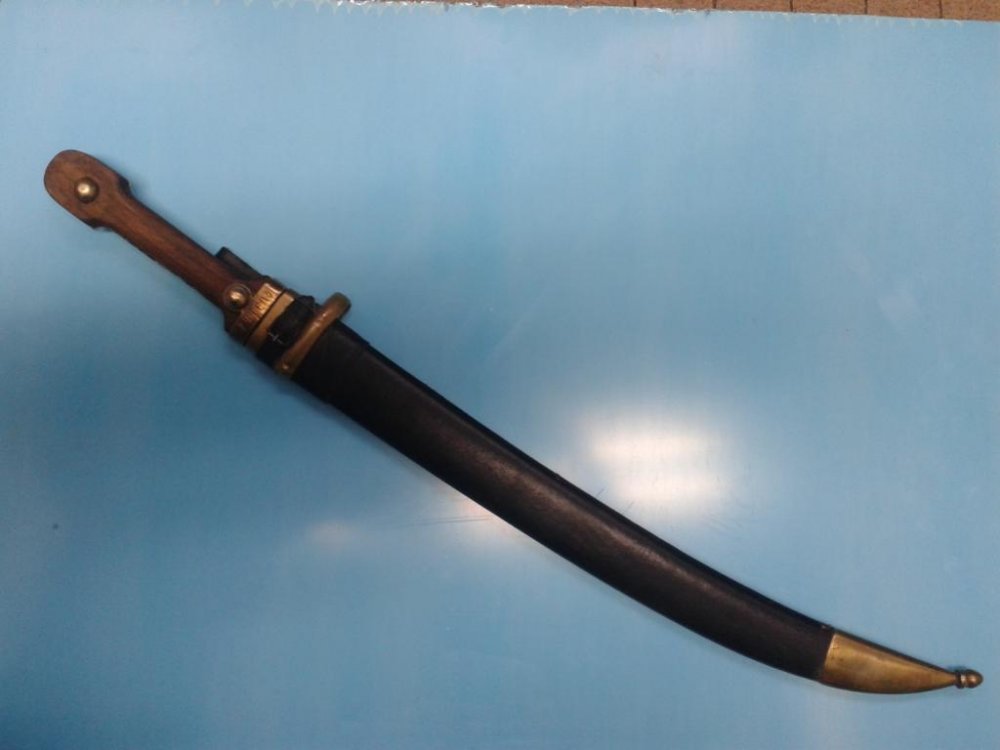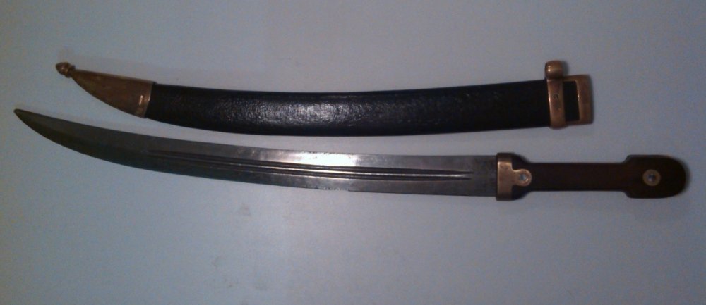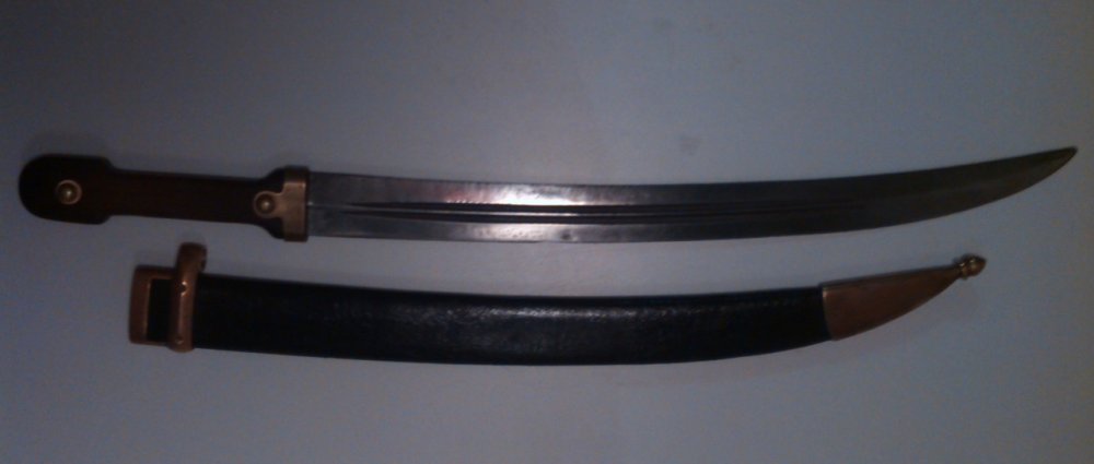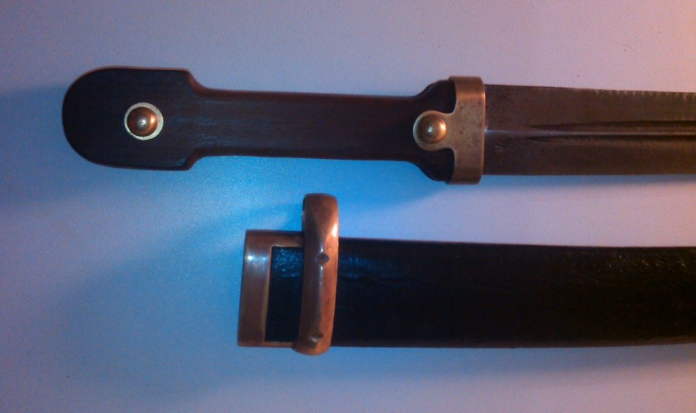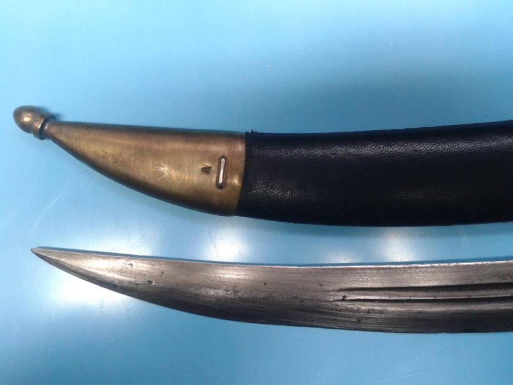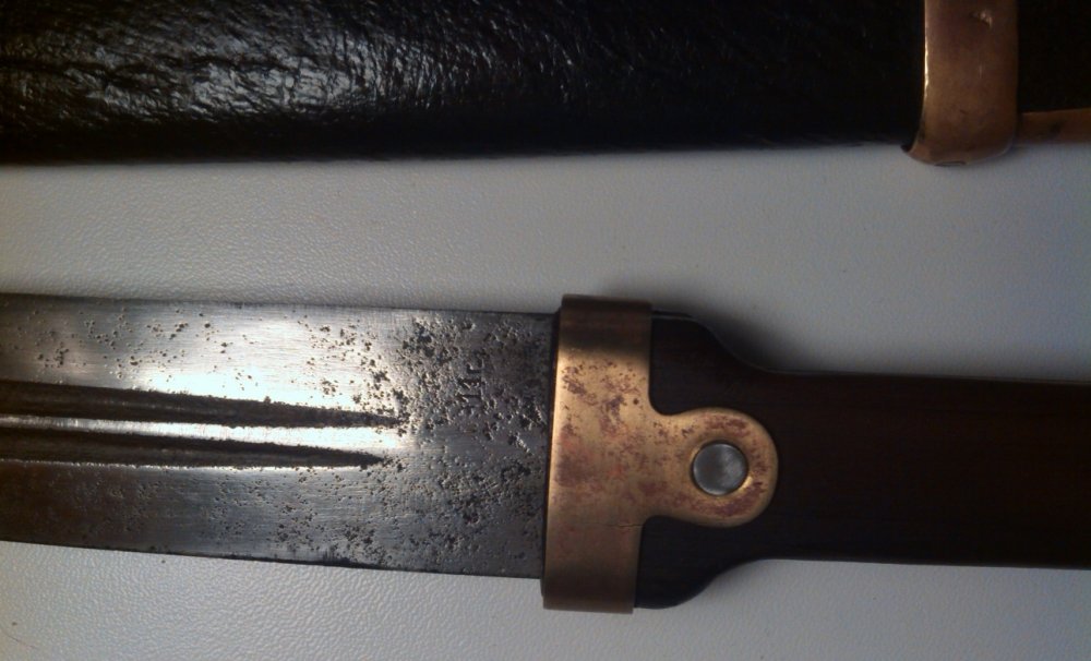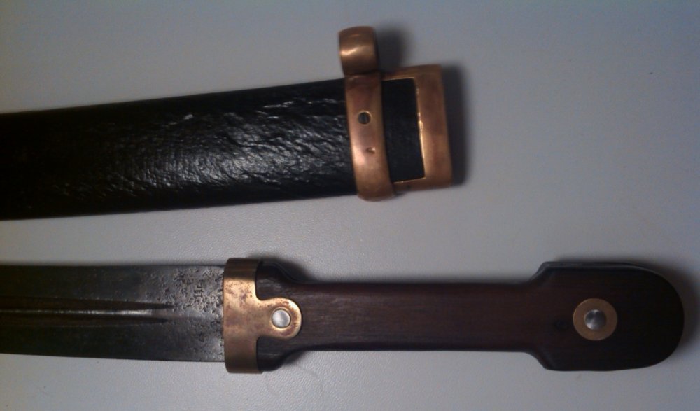 Как в первом предмете, так и во втором оригинальные клинки и фурнитура ножен. Второй клинок , судя по просматриваемым клеймам на нем, принадлежал бебуту раннего типа (до 1912 г) и он должен быть вообще без латуньевой обоймицы на рукояти. На ножнах кожа не родная это видно визуально.