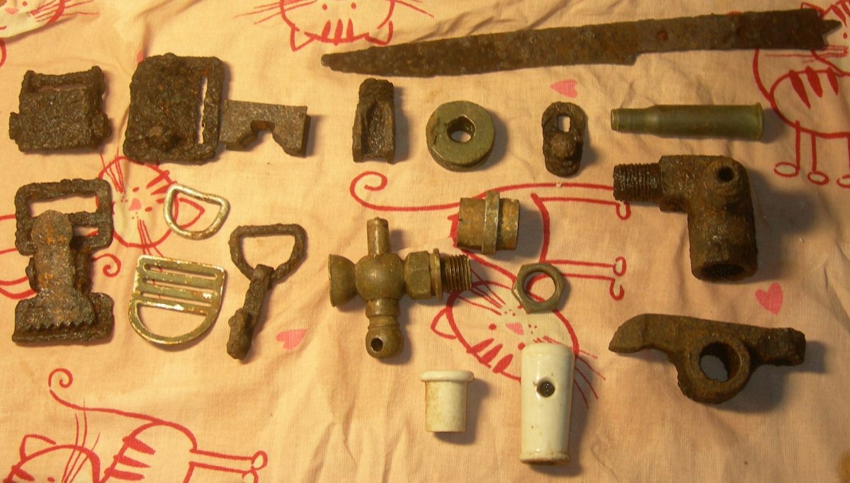 Добрый день попались железные предметы з двух кучек . Номер 1 - все найдено вместе ,номер 2 - тоже всё лежало вместе - интересно , как крючёк закрывается - если в конце отверстие под гвоздь . Предметы все по войне, найдены возле окопов . С ув.