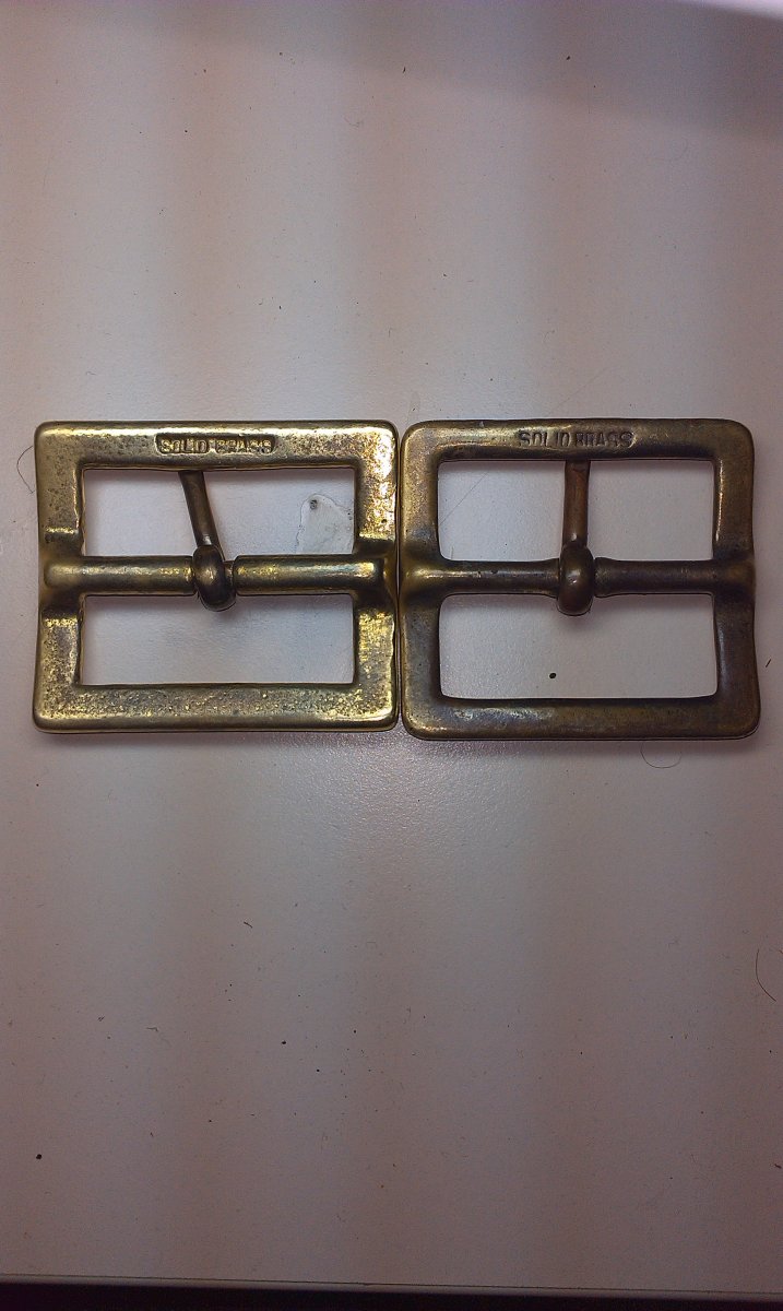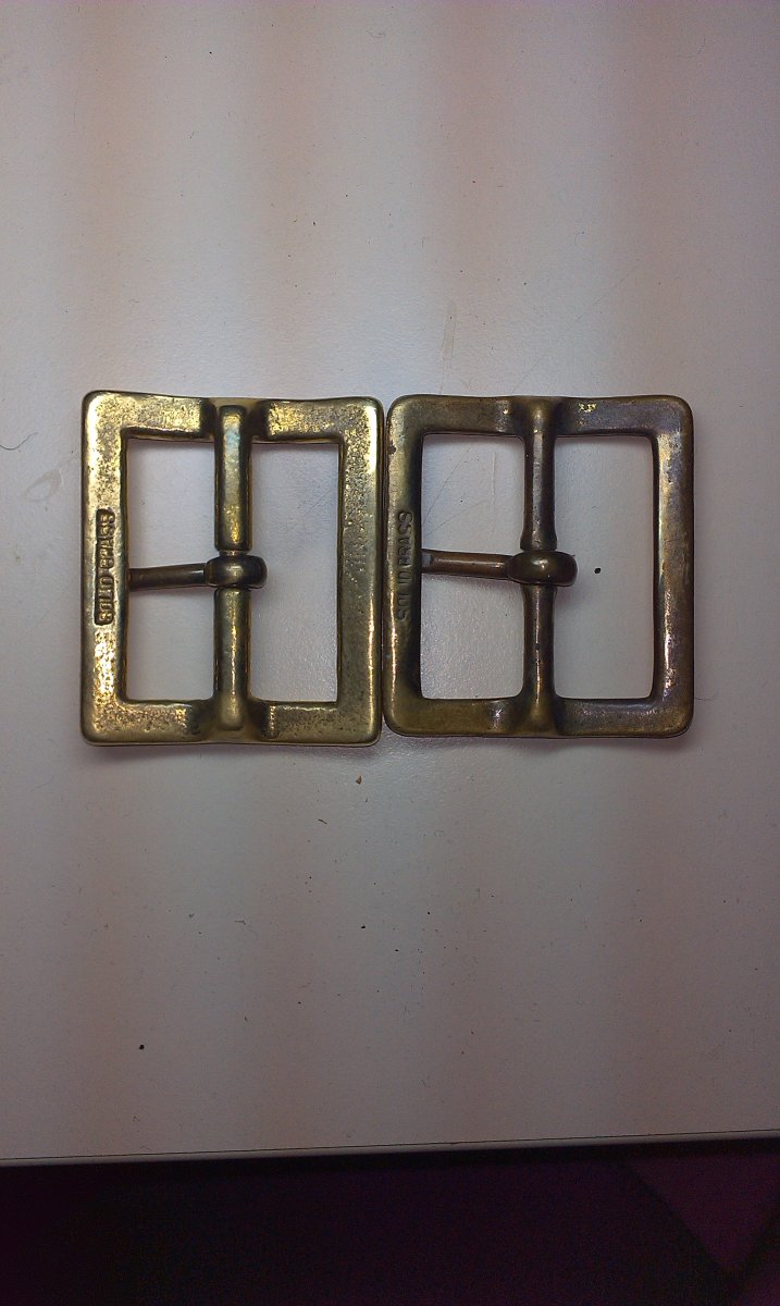 Но сегодня попался другой, коричневый, с клеймом 1947 года на хлястике. Пряжки из латуни (Solid brass), но немного разные, по размерам и толщине металла. Ширина полотен 41-42 мм.