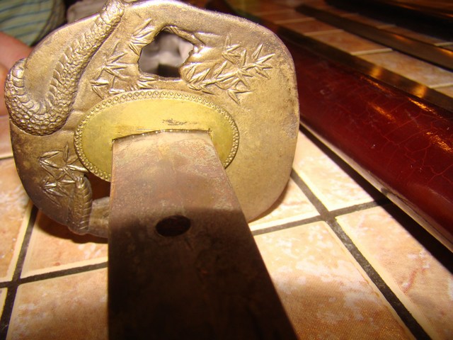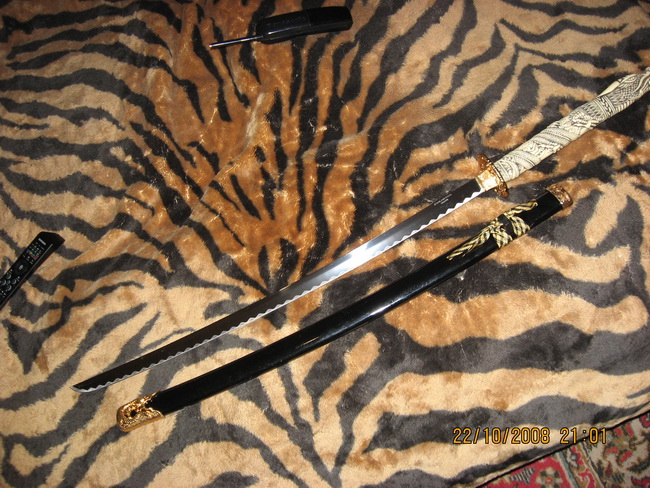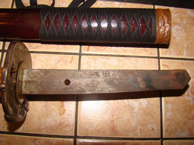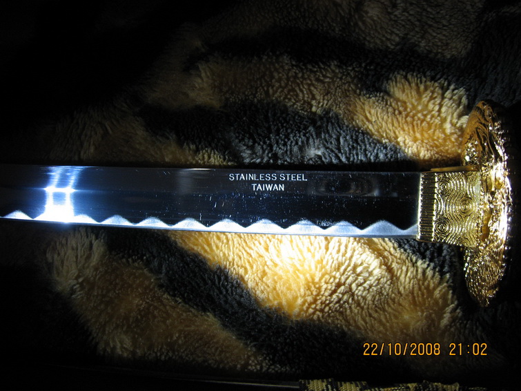 Ответ: Два самурая Вот так выглядит сувенирка стоящая около 200$,причем не CHINA а TAIWAN.Лезвие натур 440 сталь,заточенная(бриться можно).Так внутри рукоятки к лезвию приварен обычный длинный болт 6мм.Думаю из-за этого он и не является ХО(сертификат имеется).Но,думаю,даже этим башку снести на раз.Здесь клинки явно кованные,китаёзы небудут так заморачиваться на копеечных массовых вещах.