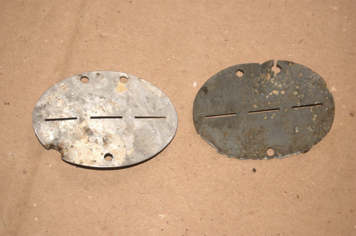 Здравствуйте, помогите с оценкой. Тот что ударен лопатой: материал цинк, потери по кромке есть, надпись видно хорошо. Второй: ударен или пулей или осколком,материал алюминий, надписи хорошо видно, коррозии практически нет. Жетоны ничем не чищены, просто помыты водой.