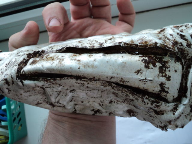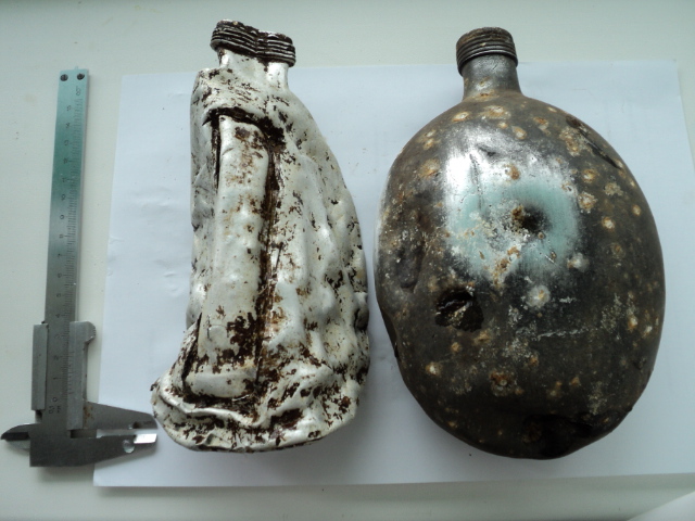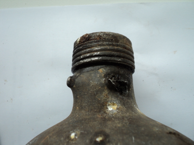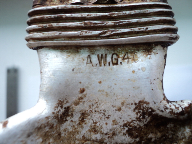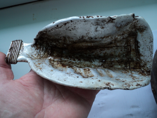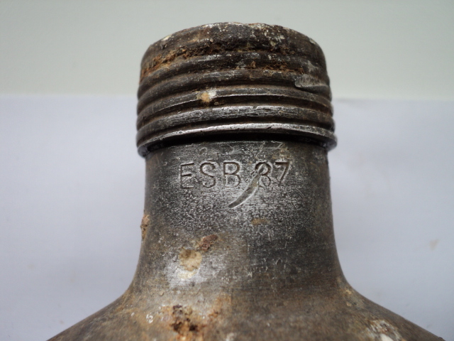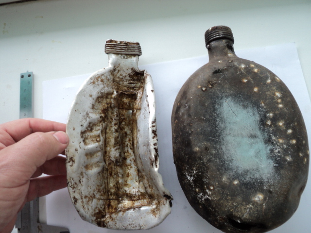 Вот попались такие убитые фляжки. Одна пробита осколками с клеймом ESB 37. Из второй немцы сделали совок. Вырезали кусок и расплющили. У нее клеймо A.W.G.40. И еще ключик, жаль не работает. От чего он будет?