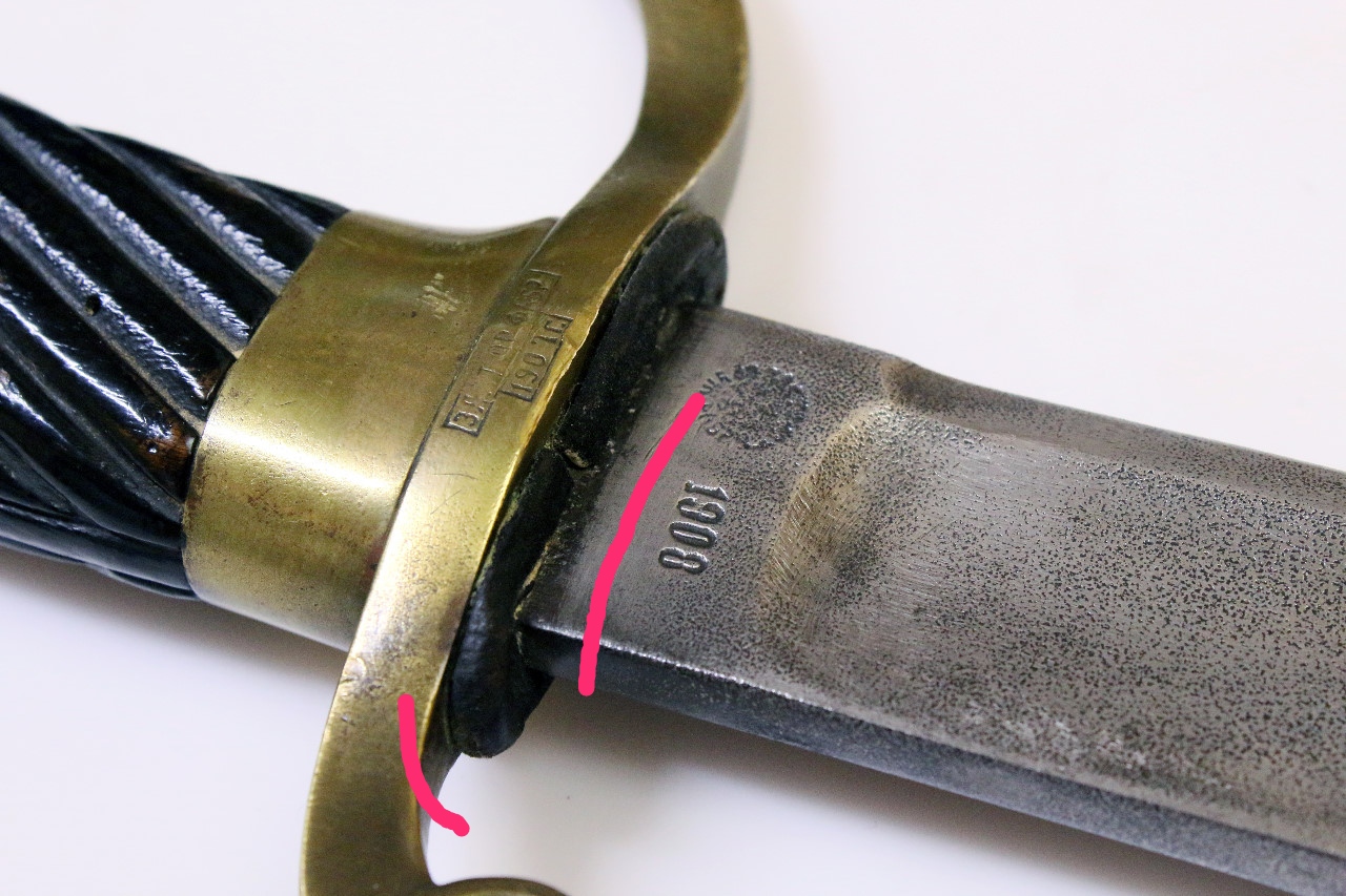Возможно такой ракурс, а так для драгунки 1908 года боевой конец явно коротковат. Попросите у продавца длинну клинка и нормальное фото (не под углом). По офицеру, внимательно посмотрите на стыковку черена с крестовиной, а так-же расположение черена по отношению к клину. Так собрать в то время просто немогли, а предмет типа в минте.