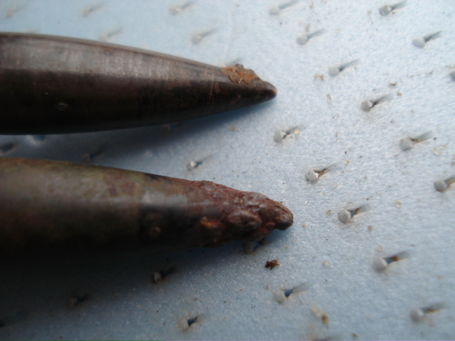 Кстати, эти пули действительно опасные. А ведь не удержался и еще одну пулю решил достать. Хорошо, что на балконе это делать стал, да к тому же дождь шел. Только пассатижами достал пулю, она как вспыхнет. Причем несколько осколков упало на пол и все это горит. Большую часть пули, я запустил с балкона. А остатки фосфора на полу балкона и на пассатижах было не погасить, пока они сами полностью не прогорели. Так, что адреналина было достаточно. Ну а третий патрон, кстати по маркировке вполне безопасный выкинул не разбирая. Что удивительно у всех трех была осечка в 45-м. Так, что кому-то жизнь не прервали, возможно.
