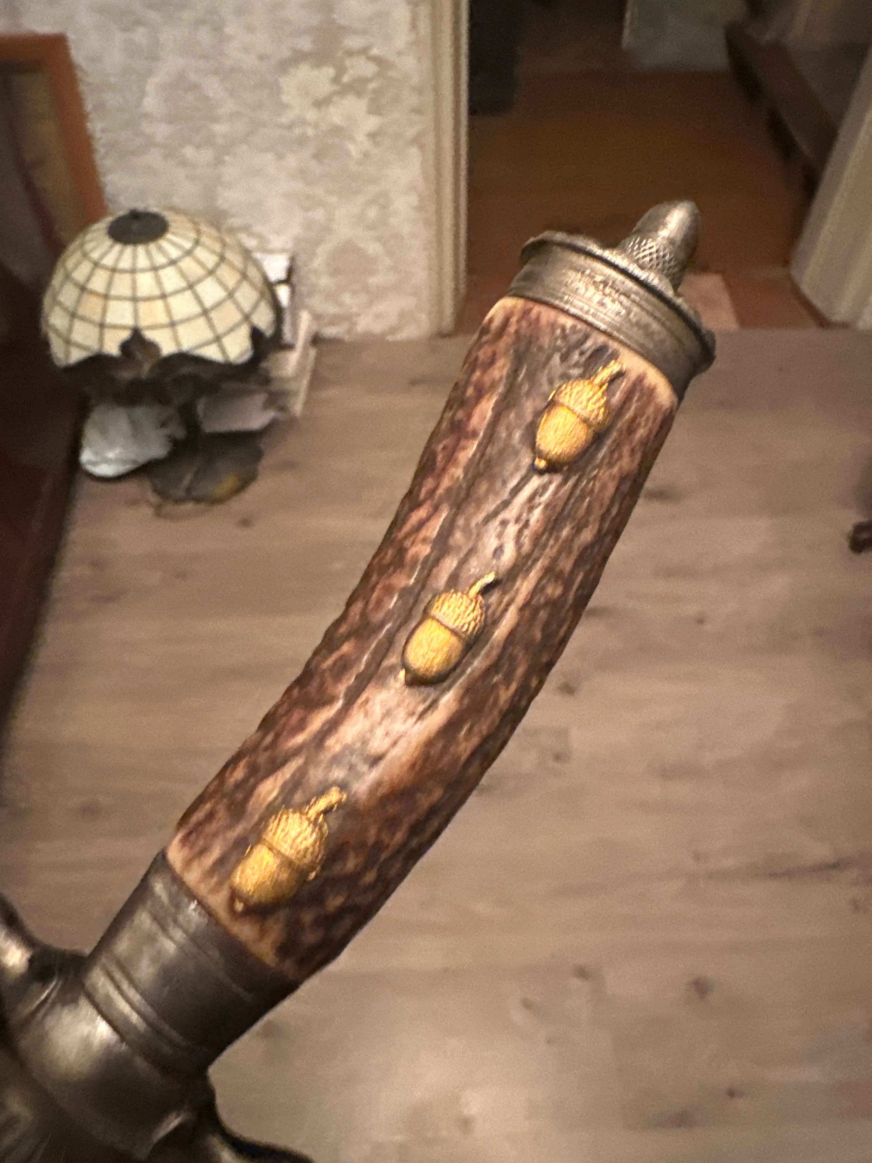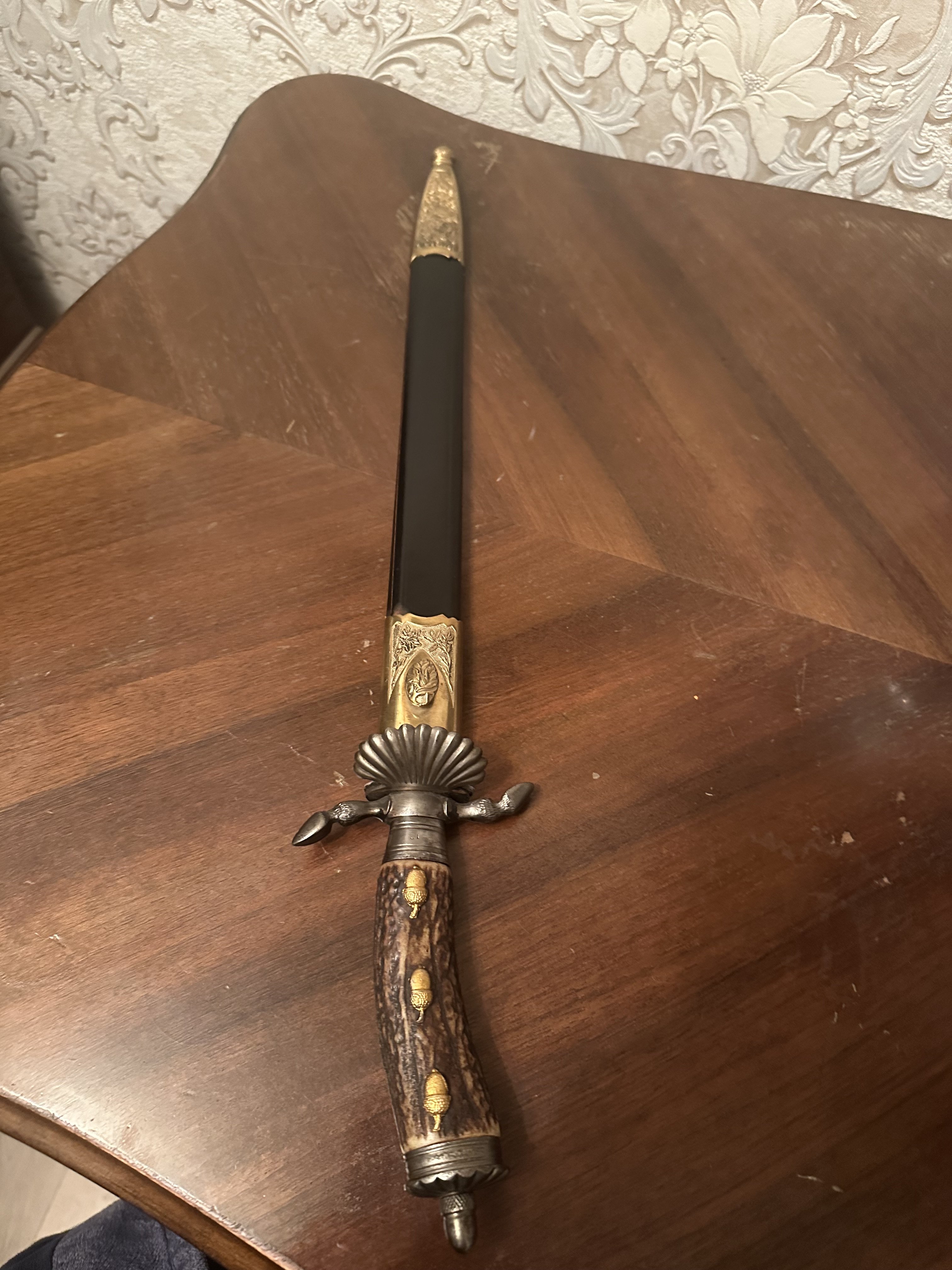Подлинный Немецкий олений кортик рядового егеря, период ПМВ(Веймар период), производитель WKC,ножны и желуди в рукояти новодел. Травление на клинке утрачено, состояние очень плохое, интереса для коллекционеров не представляет.