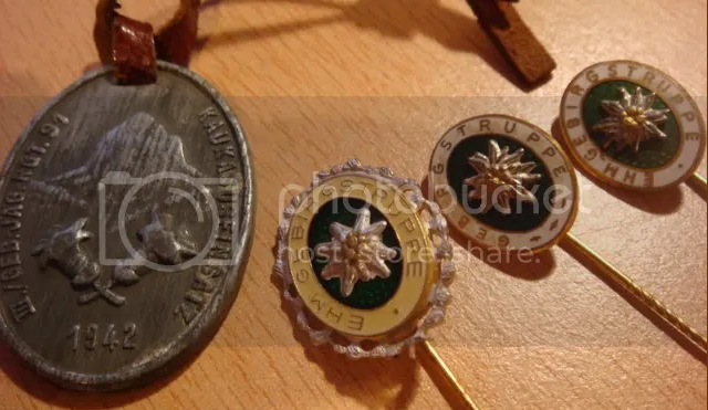 знак "1. gebirgs - division" обговорювався тут https://www.wehrmacht-awards.com/fo...-division-pin-help-with-identification-please теж післявійна.
