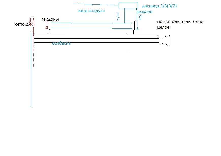 Колбаска толкает рычаг в точке"А",Магнит движется к геркону ,геркон дает команду отсекающему ножу.