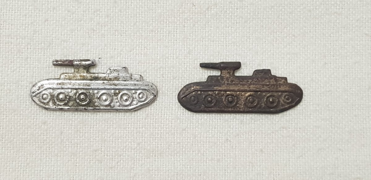 Приветствую, камрады. Эмблемы АБТВ РККА. Размеры эмблем - 31х12(12,5) мм. Первая эмблема - серебристая, вторая эмблема - золотистая. Состояние и подробности на фото. Благодарю за внимание.