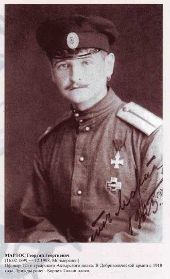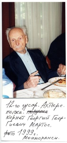 Историк Виталий Жуменко писал о корнете-ахтырце Г.Мартосе: "В своё время имел счастье встречаться с этим чудным стариком на всяческих встречах... Говорил, что он гусар и пусть всё в прошлом, но приятно разглядывать женщин молодых. У него было ухо проколото. На праздники ахтырцев он и в эмиграции надевал серьгу Святослава. Воспитание, ум, юмор, шарм. Это что-то! Какая-то раса неземная были эти старики. Вот довелось к чуду прикоснуться. Через пропасть времени. Под самый занавес." Корнет Ахтырского гусарского полка Георгий Мартос в 1925 году и в 1999-м году.