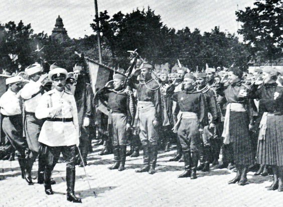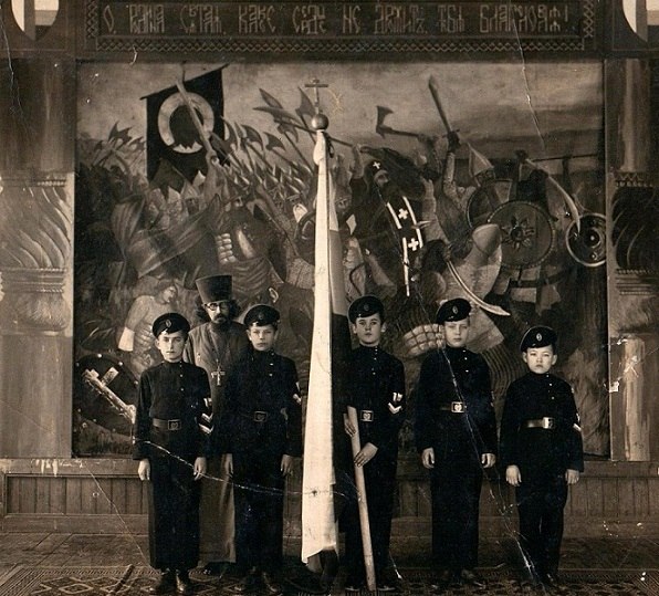 София. 1935 год. Из воспоминаний П.Н.Буткова: "Я помню, как наши гимназисты (впереди мальчики, за ними девочки) в черных гимнастерках со знаменами и оркестром проходили стройными рядами, печатая шаг, перед царем, который всегда с нами здоровался по-русски ("Здравствуйте, молодцы"). Мы же, держа равнение направо, как один своими зычными голосами отвечали: "Здравия желаем, Ваше Величество", и всегда он нас хвалил: "Молодцы", а мы в ответ: "Рады стараться, Ваше Величество. Ура!" После того как проходили наши девочки в полых блузках и темно-синих юбках, я командовал начинать наши песни - "Скажи-ка, дядя" (Бородино) или же "Разбойнички". Затем выбегали вперед плясуны, которые под нашу песню ("Ах вы сени, мои сени") начинали плясать перед строем. Огромная толпа болгар, которая стояла по обеим сторонам на тротуарах бульвара Царя-освободителя, от восторга просто ревела, и многие бросали нам цветы. Это были незабываемые моменты во время нашего пребывания в Болгарии. На гражданский праздник, 24 мая в день праздника Святых Кирилла и Мефодия, выходили все учебные заведения на площадь храма-памятника Александра Невского (построен в память освобождении Болгарии), и после службы и молебна царь Борис обходил все учебные заведения и здоровался с учащимися…" Царь Борис обходит строй "Российских соколов".