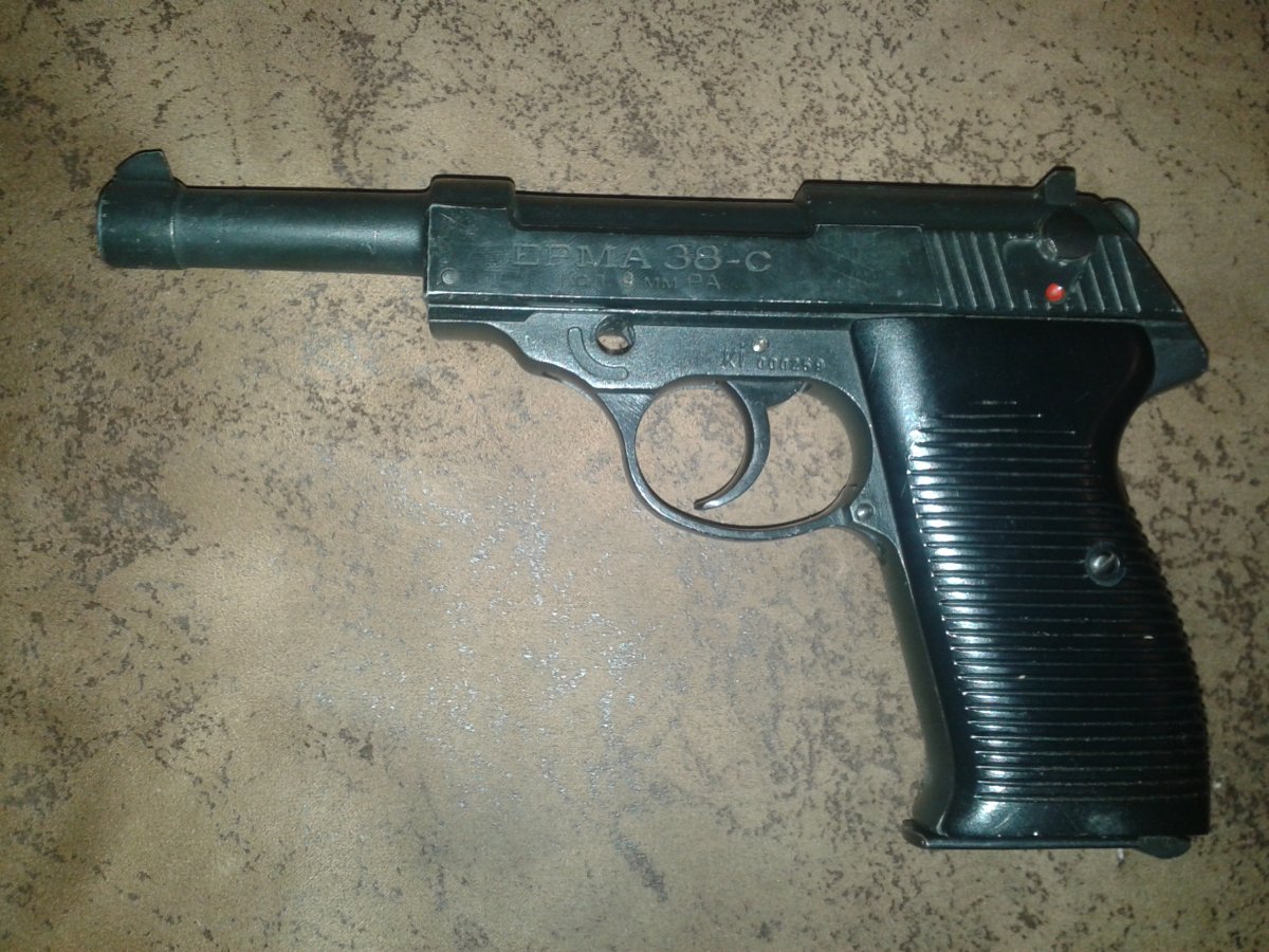 Оцените сей предмет Нашего производства Эрма 38-с для стрельбы холостыми 9 РА. Куплен давно на барахолке. Дросельное отверстие заводское сверху, ствол заглушен наглухо. Недостатки-сломано "крыло" предохранителя, но в нужном положении (силумин) и нету ствольной задержки. Говорят подходит с Р1. Я вставлял подогнанный штифт для "хлопанья". В комплекте магазин.