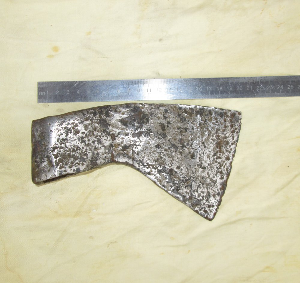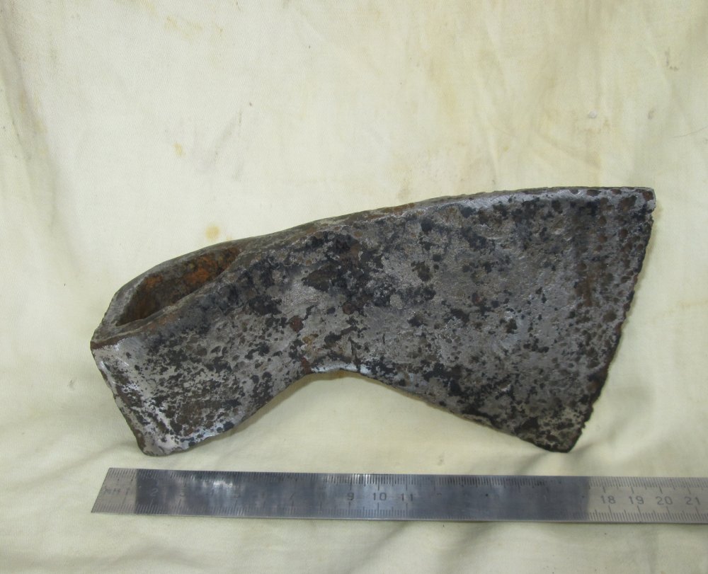 Дабы не плодить новых тем,выставляю на определение топор(самостоятельно найти его происхождение не удалось).Вес 1,2кг(после чистки 1,150кг),общая длина 200мм,длина заточенной части 115мм.Вместе с топором много находок накопальсь по ПМВ.А по ВМВ,было много принадлежностей советских бойцов,немцев,италов,венгров и румын.За ранние благодарен.