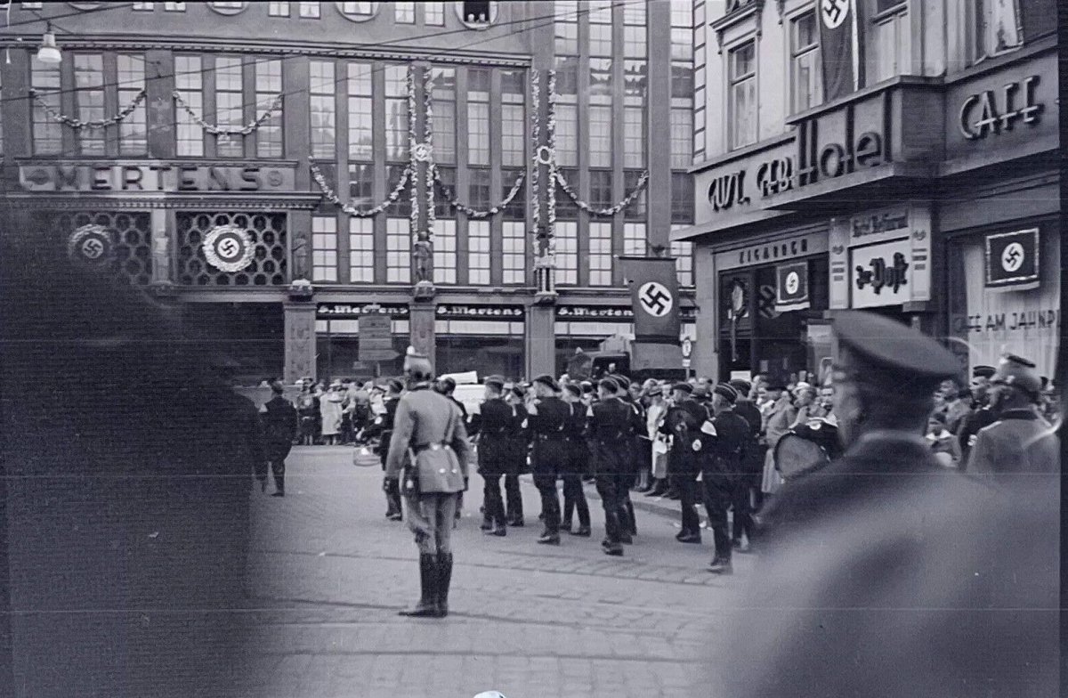 1-2) Aufmarsch Musikzug 1. Mai 1939 3) Musikzug marschiert durch Frankfurt 5) Nürnberg, Schöner Brunnen 6) Parade Grosse Frankfurter Str., Berlin 7) Parade vor Junkers Werke Dessau
