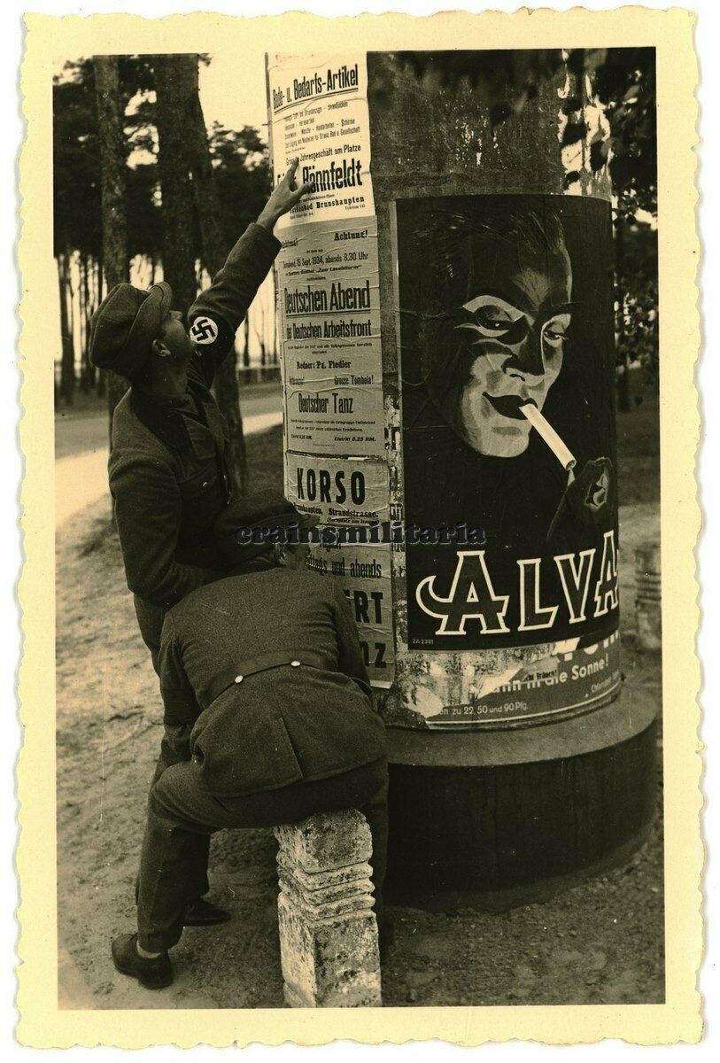 1) Arbeitsmänner der RAD-Abteilung 2/60 oder 1/61 bei Werbung, ua für Korso am Strandstrasse Brunshaupten, Deutschen Abend in Gasthof "Zum Leuchtturm" usw, im Raum Wismar, 1934 2) Offiziere bei "Singer" Werbung an einem Bahnhof in Tschechien (Schild "Vyska nad morem")