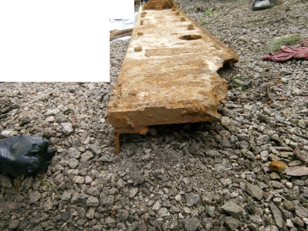 Вітаю камради! Накопався отакий шматок броні: Довжина 225см., ширина 33 см., товщина бронелиста 30, по краях 25 мм. З тильного боку металевий кутник, до якого був прикручений бронелист. Колір жовтий поверх червоного грунту. На лицьовому боці залишки механізму для якогось навісного обладнання, прикручений болтами до бронелиста: Іще навколо купа всякого металу: У кого є думки від чого це залишки?