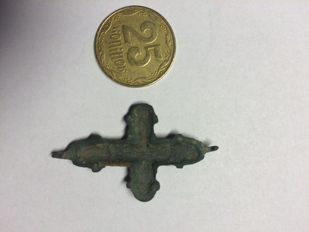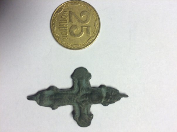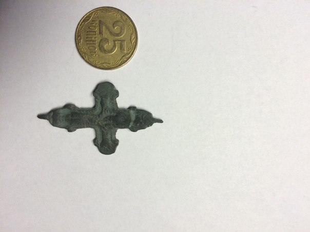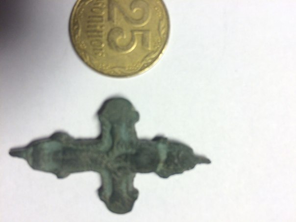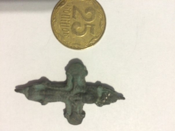 Добрый вечер. Энколпион. Распятие. Литье, Энколпионы данного типа датируются исследователями 12 – первой половиной 13 века. Лицевая створка круглоконечного энколпиона с прямым средокрестием и каплевидными выступами на оконечностях. На ней – рельефное изображение Распятия, близкое к иконографии триумфирующего Христа – он как бы стоит, прислонившись к кресту, тело почти прямое голова в нимбе прямая, руки прямые. Голова и кисти рук непропорционально велики. Створка имеет одинарные шарнирные петли на верхнем и нижнем концах. С ув.