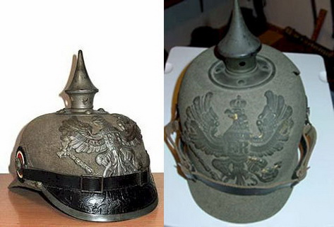 Это абсолютно два разных шлема . Один образца 1905-06 года . второй обычный эрзац , поэтому на нем нет боковых кожаных вставок