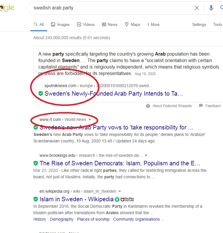 Сорі, але новина про "шведську арабську партію" є скоріше кацапською пропагандою. Вводимо в Гуглі пошук про цю партію - маємо тільки дві новини, одна від Спутініка, друга від РТ. Коли новина є занадто шокуюча щоб бути правдою (нрп. абсурдна новина що араби створили партрію щоб виселяти шведів) , то є велика імовірність що це так і є.