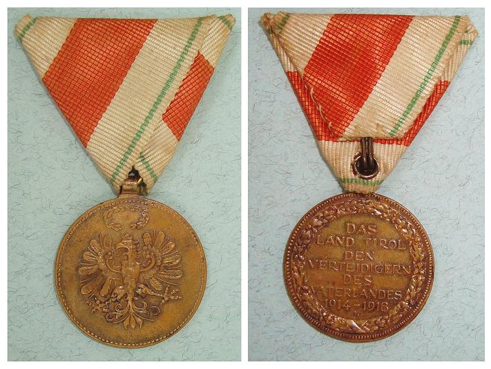 Земельная памятная медаль 1914-1918 гг. учреждена Ландтагом Тироля 07.02.1928 г., принявшим соответствующий Тирольский земельный закон (Tiroler Landesgesetz). Его положения были опубликованы в 28-м выпуске Вестника законов и постановлений земли Тироль от 23.06.1928 г. (Landes-Gesetz- und Verordnungsblatt für Tirol, IX. Stück, 23. Juni 1928, Nr. 28). В Германии эта награда была также известна как “Памятная медаль за оборону Тироля в 1914-1918 гг.” (Errinnerungsmedaille für die Landesverteidigung von Tirol 1914-1918). Награда предназначалась всем участникам Первой мировой войны, которые по состоянию на 01.11.1918 г. являлись жителями Тироля, а также тем, кто в период с 1915 г. по 1918 г. несли военную службу по защите этой области. Учреждение медали подчеркивало преемственность традиций фронтовиков Великой войны с защитникам родного края, сражавшихся в войнах 1796-97, 1848, 1859 и 1866 гг. Вручение Земельной памятной медали 1914-1918 гг. носило коммерческий характер. Так, для получения награды тирольцы должны были оплатить пошлину в размере 2 шиллингов, которые перечислялись на благотворительные цели в Земельный фонд жертв войны (Landes-Kriegsopferfond). Впоследствии список лиц, признанных достойными награждения Земельной памятной медалью 1914-1918 гг., неоднократно расширялся. Так, в соответствии с Постановлением от 28.05.1930 г., к таковым были причислены женщины, пострадавшие от боевых действий в годы Первой мировой войны, служившие в инфекционных госпиталях и несшие службу на железных дорогах. Через три месяца, 28.08.1930 г. награждение медалью было распространено на жителей западной австрийской земли Форарльберг (Vorarlberg), а 21.11.1931 г. – на офицеров из подразделений “императорских егерей” (k.u.k. Kaiserjäger), Тирольского ополчения (k.u.k. Standschützen), а также Тирольского и Форарльбергского полка горной артиллерии “Кайзер” № 14 (Tiroler und Vorarlberger Gebiergsartillerie Regiment “Kaiser” Nr.14), которые не принимали участие в обороне Тироля, будучи взятыми в плен противником. Постановлением от 27.02.1932 г. медаль могли получить и гражданские лица, принимавшие участие в Первой мировой войне и являвшиеся кавалерами императорских знаков отличия. Последнее изменение статута награды состоялось 30.05.1935 г., когда соответствующее Постановление расширяло решение от 21.11.1931 г. и распространяло его положения не только на офицеров, но и на всех нижних чинов, квартировавшихся в Тирольском военном округе и сражавшихся на Итальянском фронте в кровопролитных битвах при Изонцо. Всего же по состоянию на март 1940 г., когда награждение медалью было прекращено, кавалерами награды стали около 120,000 человек. Награжденному медалью вручалось удостоверение с факсимиле Главы правительства земли Тироль (Ландесхауптманна). Эту должность занимали Франц Штумпф (Franz Stumpf, 07.06.1921-28.02.1935) и Йозеф Шумахер (Josef Schumacher, 21.03.1935-12.03.1938), а после аншлюса Австрии Франц Хофер (Franz Hofer), являвшийся ландесхауптманном и гауляйтером НСДАП Тироля-Форарльберга. Эскиз награды разработан д-ром Готхардом Фрайхерром фон Ан дер Ланом (Dr.Gotthard Freiherr von An der Lan, 17.06.1872-16.03.1934), в годы Первой мировой войны командовавшим батальоном Тирольского ополчения “Инсбрук I” (k.u.k. Standschützen Bataillon Innsbruck I), а в послевоенное время являвшимся руководителем Стрелкового общества Тироля (Landesoberschützenmeister). Штамп медали выполнен венским медальером Йозефом Таутенхайном-младшим (Josef Tautenhayn der Jüngere, 10.09.1868-08.02.1962). На аверсе медали расположен герб Тироля – обращенный влево и увенчанный короной орел с распушен