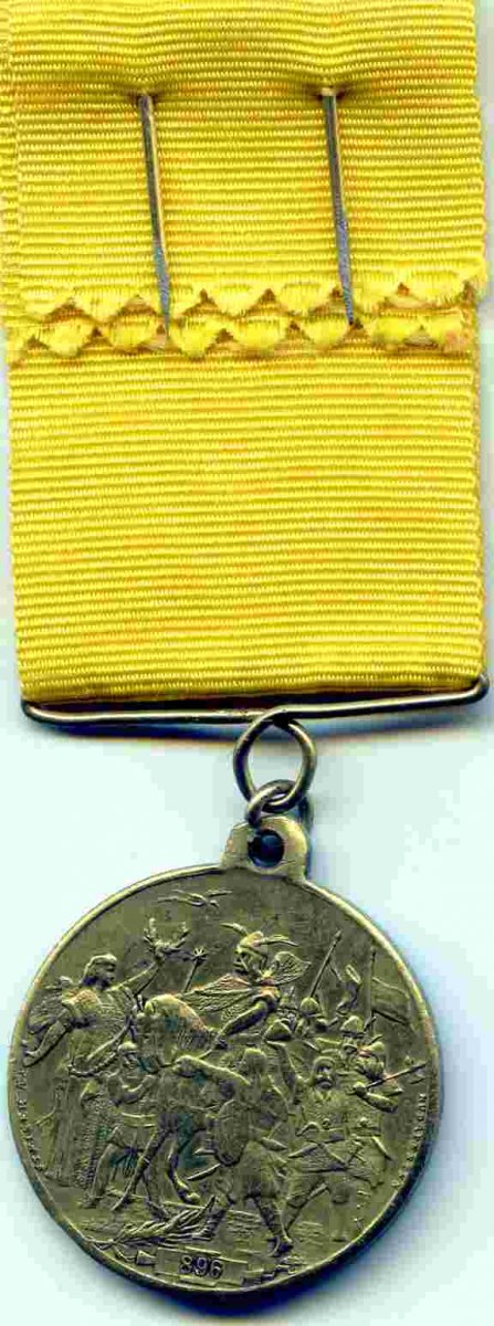 Медаль тысячелетняя годовщина Венгрии Бронзовая медаль диаметр 33 мм. Аверс с сидящей фигурой императора Франца Иосифом I увенчанный венгерской короной Святого Стефана, стоящая фигура в раннем средневековом платье слева от коронованного императора с лавровым венком, фигура справа со щитом несущего руками Венгрии в его правой руке, меч в его левой руке, очерченной надписью «EZRÉDEVES TÖRTÉNETÜNK EZREDEKRE REMÉNY NEKÜNK» (тысячелетняя годовщина истории, тысяча лет надежды для нас) и датирована «1896» внизу. Реверс с, А́рпа́д лидер венгров, прибывший в Венгрию верхом, окруженный своими пешими сторонниками и встреченный стоящей женской фигурой, предлагающей лавровый венок, пальмовую ветвь и датированную внизу «896», подписанный «STEINER A» и «BUDAPESTEN». А́рпа́д (примерно 850-907) был первым известным лидером мадьяров и в 896 привел их через карпатские горы впервые в то, что в настоящее время является частью Венгрии. Представление о самом себе Франца Иосифом I в качестве наследника и преемника А́рпа́д является странным, особенно так как венгров в 1867 принудила Габсбургская монархия на Компромисс, который создал двойственное государство Австро-Венгрия. Эта медаль – интересная часть политики Габсбургов не более чем венгерская националистическая пропаганда.
