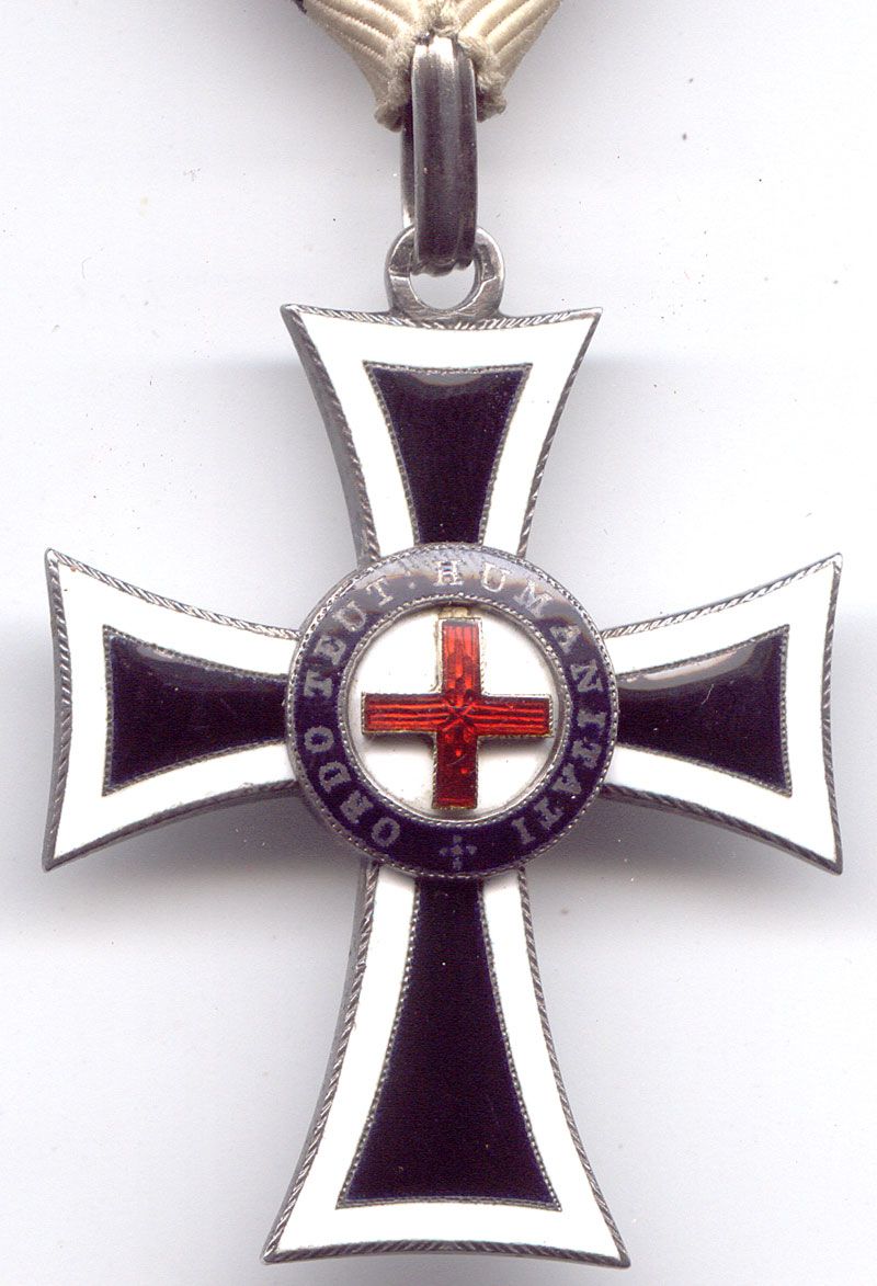 Мариaнский Крест Тевтонского Ордена Св. Марии Ерусалимской Marianerkreuz des Deutschen Ritterordens После того, как магистр «Ордена тевтонских рыцарей госпиталя Пресвятой Девы Марии в Иерусалиме» Альбрехт Гогенцоллерн в 1525 году принял протестантизм, папа римский, как глава всех духовных и военно-духовных орденов, прекратил существование «тевтонского ордена». В 1834 году орден был восстановлен римской курией, как балготворительный, а его главой должен был быть кто-нибудь из династии Габсбургов Лотарингских. Во время Первой мировой войны орден занимался организацией медицинской помощи раненым. Ныне орден преимущественно женский, а во главе его стоит назначаемый папой римским священик. Награда, связанная со священным орденом немецких рыцарей, была основана 26 марта 1871 года в двух классах: нашейный «Рыцарский Мариaнский крест» (65х44 мм, диаметр центрального медальона 15 мм) и нагрудный «Мариaнский крест» (42х35 мм, диаметр центрального медальона также 15 мм). По краю медальона на фоне из черной эмали идет серебряная надпись «ORDO TEUT. HUMANITATI» (Немецкий орден человечности). В середине медальона на фоне из белой эмали размещается крест (приблизительно 9х9 мм), покрытый красной эмалью. В центре медальона на реверсе креста располагаются цифры «1871» — год основания награды. До 23 мая 1886 года использовалась лента церного цвета для обоих классов ордена. После была использована лента показаная на фото. Женский вариант награды носился на ленте сложенной в виде банта.