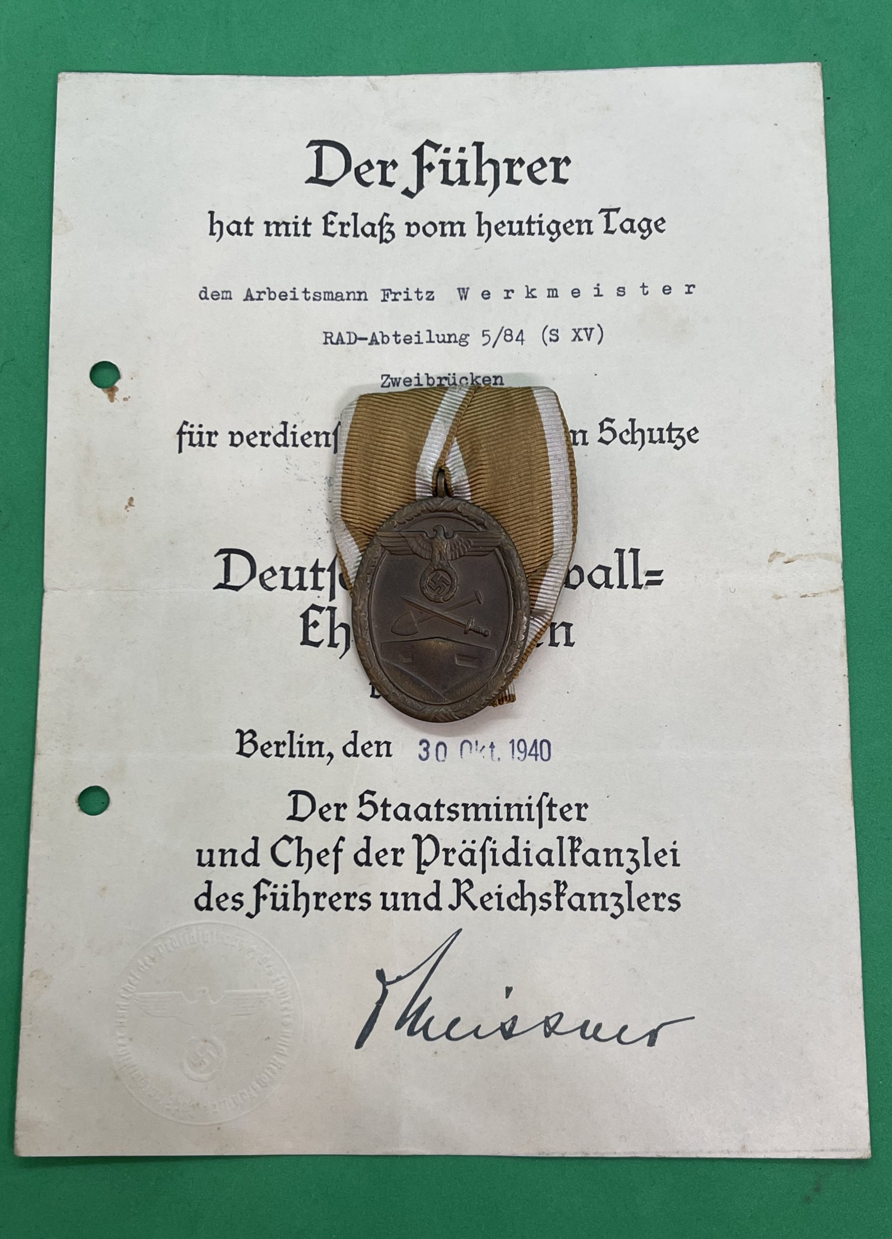 Коллеги, мое почтение. Прошу помочь оценить ряд медалей и документов по Рейху. Заранее признателен. С уважением, Илья. 1) медаль ВестВал на колодке с документом.