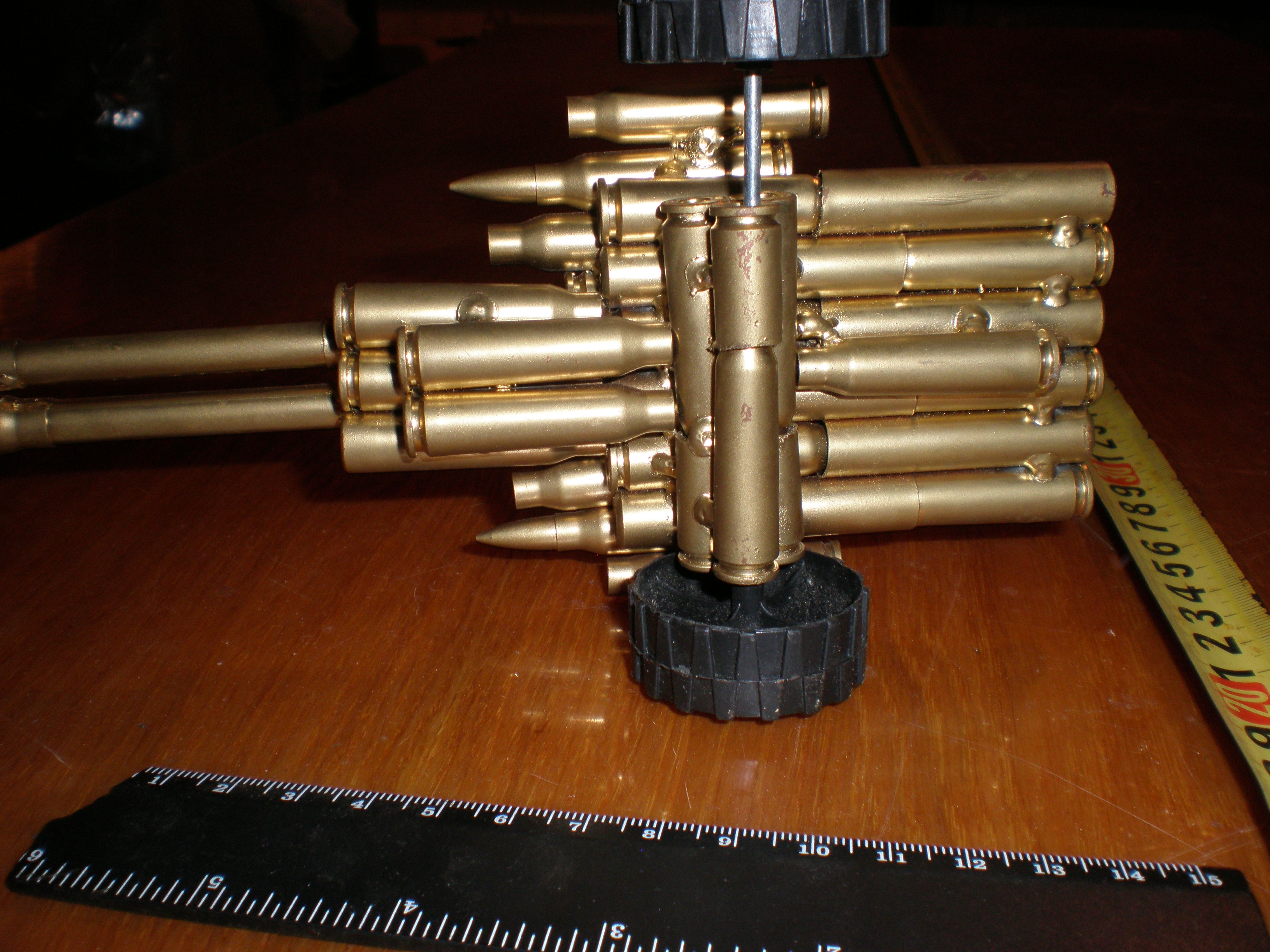 Дозвольте запропонувати Вашій увазі яскравий взірець народної творчості, а саме макет фантастичної гармати,виконаний з цілком реальних натівських ММГ-набоїв та гільз,не дивлячись на усю свою фантастичність,макет виглядає дуже переконливо та антуражно,коротше,виконаний на високому ідейно-художньому рівні. Чудовий подарунок як дитині,так і дорослому.