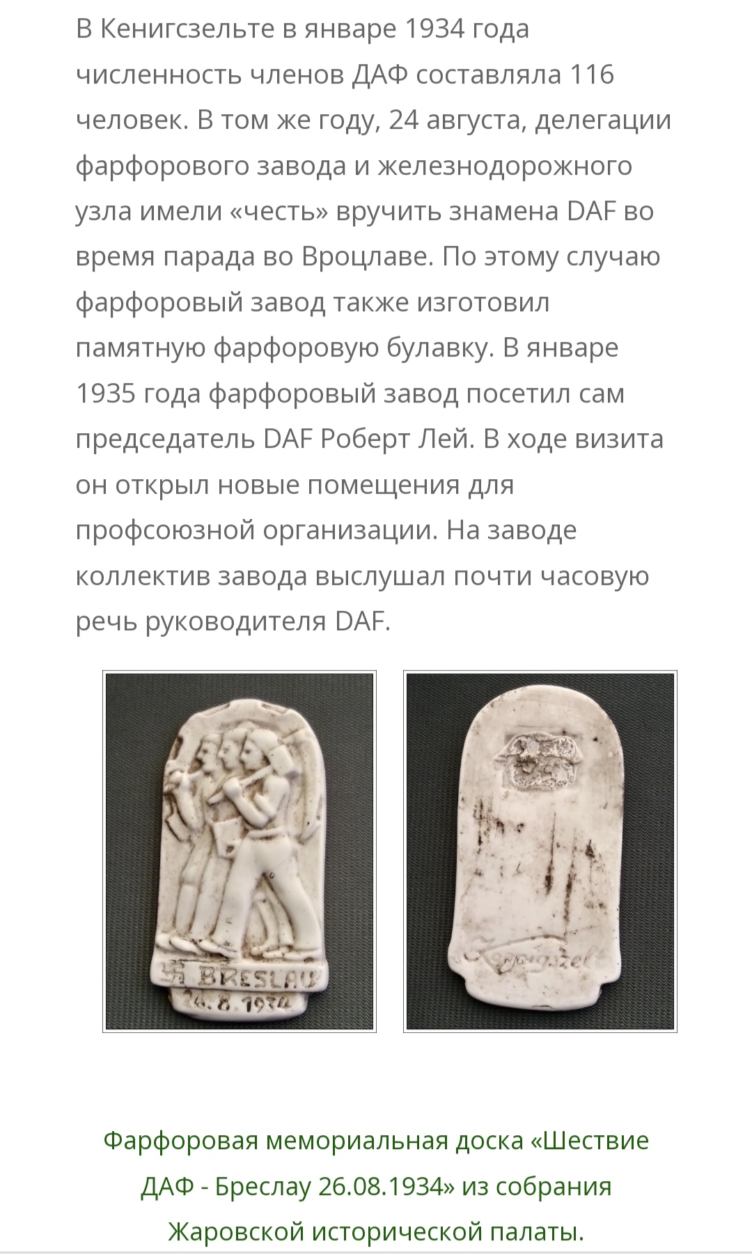 Фарфоровый памятный знак марша членов DAF в Бреслау (теперь Вроцлав) 26 июля 1934 года.