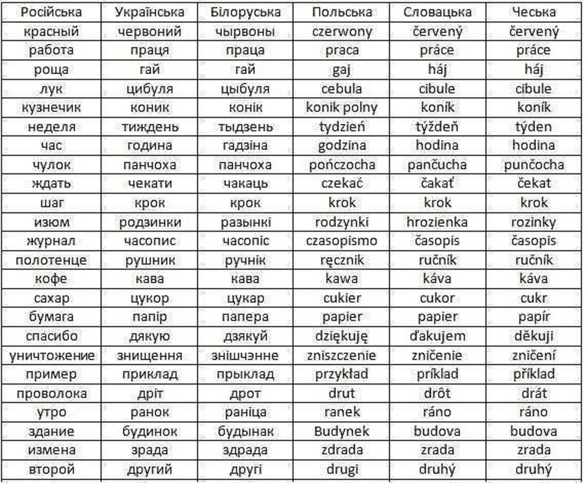 Составитель этой занятной таблицы "забыл" о болгарском/хорватском/сербском/лужичанском, потому что упомянув их таблица ровно ничего не доказывает, а наоборот опровергает. Кроме того он "несознательно" использует слова которые пришли в разные славянские из разных иностранных. Он и ему подобные пытаются найти истоки проблем в каких-то этнических и лингвистических плоскостях. А они не там вообще. Корень всех бед Украины и других ближних и дальних соседей не в том на каком наречии говорят народ называющий себя "русским" и какой процент славянской, тюркской и фино-угорской крови у них присутствует. Проблема в том что большая часть этого народа исповедует идеологию кацапизма, который является деструктивной импереалистической идеологией московского царства. Суть ее в порабощении как можно большего количества людей и превращении их в манкуртов, в ней нет ничего созидательного, только насилие и разрушение. Кацапствующий человек готов к любым насильственным действиям по отношению к тем кто отрицает величие кацапизма, который они называют "русский мир" - "всех в радиационный пепел". Существует заблуждение, что кацапом рождаются в рамках однрго этноса, это миф. Бог дает выбор, быть человеком или кацапом, каждый сам выбирает свой путь. Вся история существования кацапов доказывает, что кацапом может стать любой желающий, вне зависимости от происхождения, цвета кожи и религиозных взглядов. В отличие от других империй, где инородцам вход в высшие эшелоны власти был воспрещен, в кацапстве это не преграда, а зачастую даже +, наглядный пример для ускоренной асимиляции - " у нас любой оленевод, чурка или хахол может сделать карьеру". Кацаписты, платные или добровольные разбросаны по миру, помогают рассеюшке в борьбе за "мир". Меняется многое за сотни лет: политический строй от князя до президента, этническое происхождение правителей - от потомков нордмана Рёрика до Кагановичей-Абрамовичей. Московское княжество то прирастает землями, то теряет их. Не меняется одно - кацапизм. Это идеология, это мысле-вирус. Идеология живет в мозгах, что бы вышибить деструктивную идиологию из мозга, нужно или вымыть ее и поместить туда новую идеологию, конструктивную. Ну или послать на Заклуньский Хутор, там есть рецепт лечения.