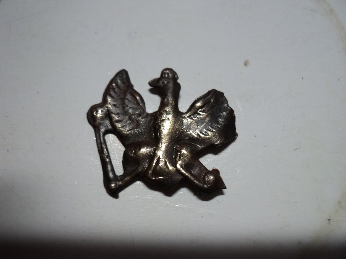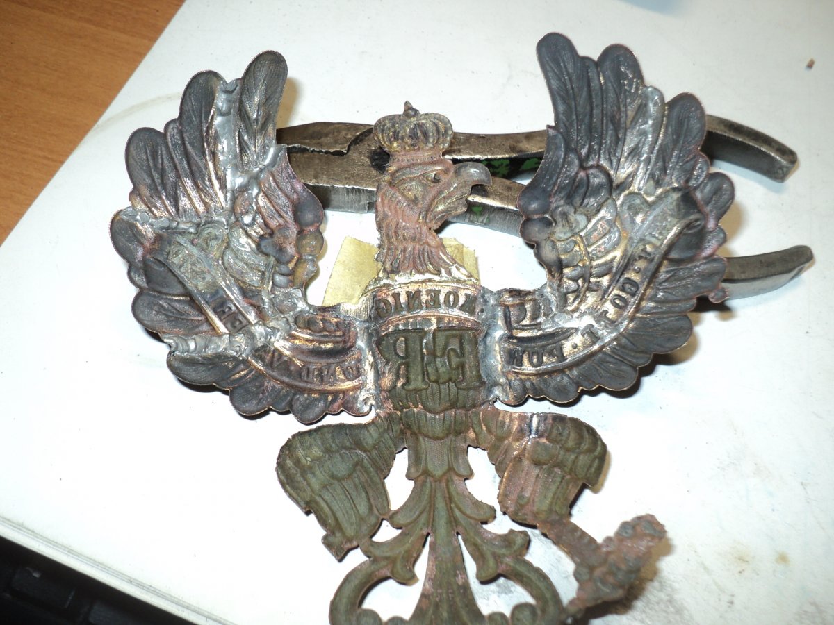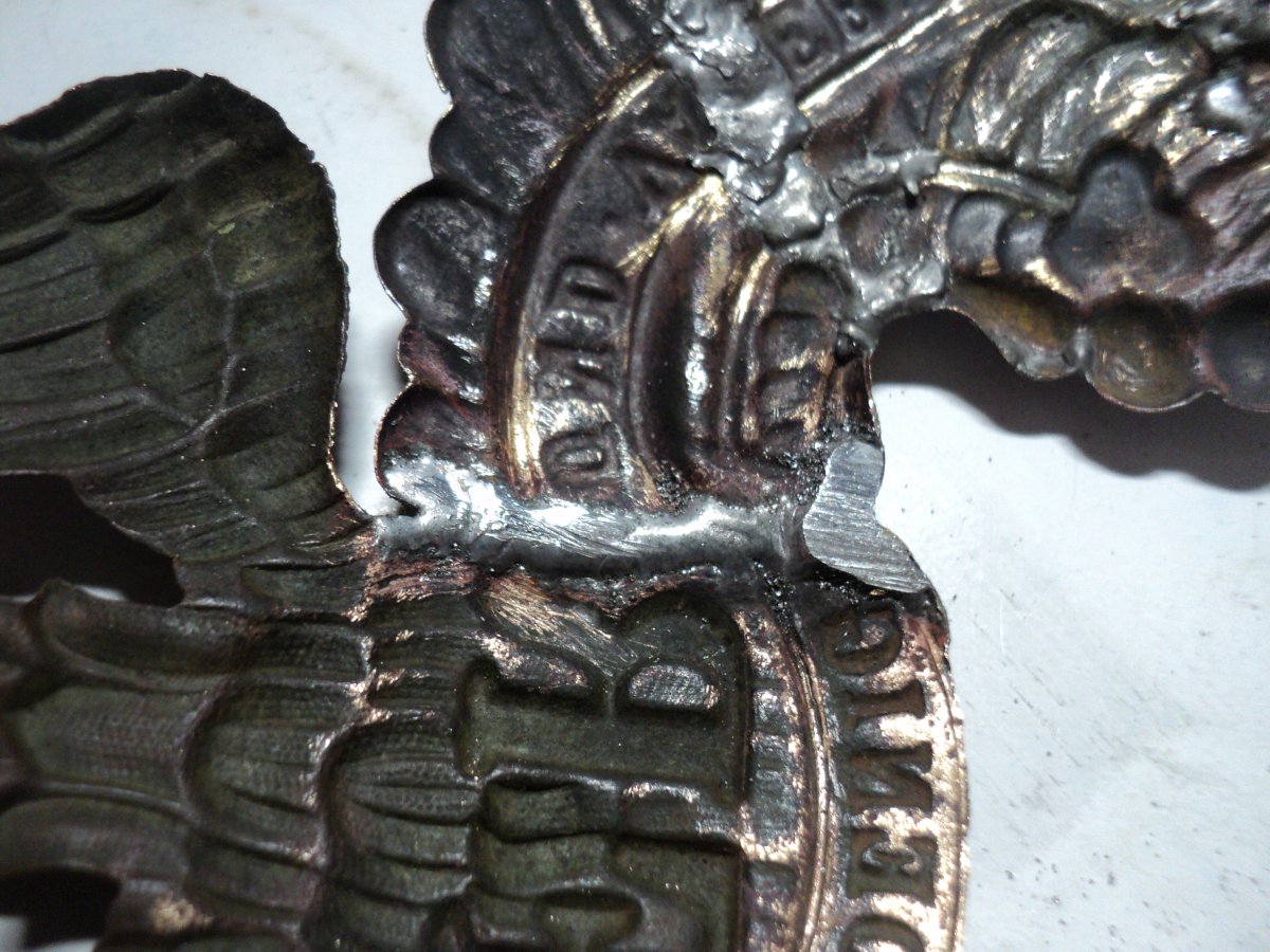 Восстановил одного орла. Прикупил "суповой набор" из остатков 3-х орлов и ободка козырька, но козырек большой и на этот пикель не подходит, будет ставиться на другой. Осмотрев все детали и складывая из них мозаику, было решено из 3-х сделать 2 и то неполных. Крыло спаяно из 3-х частей, голова и держава была отрезана с больш "убитого" орла, а также отрезана птичка скипетра из остатков крыла.