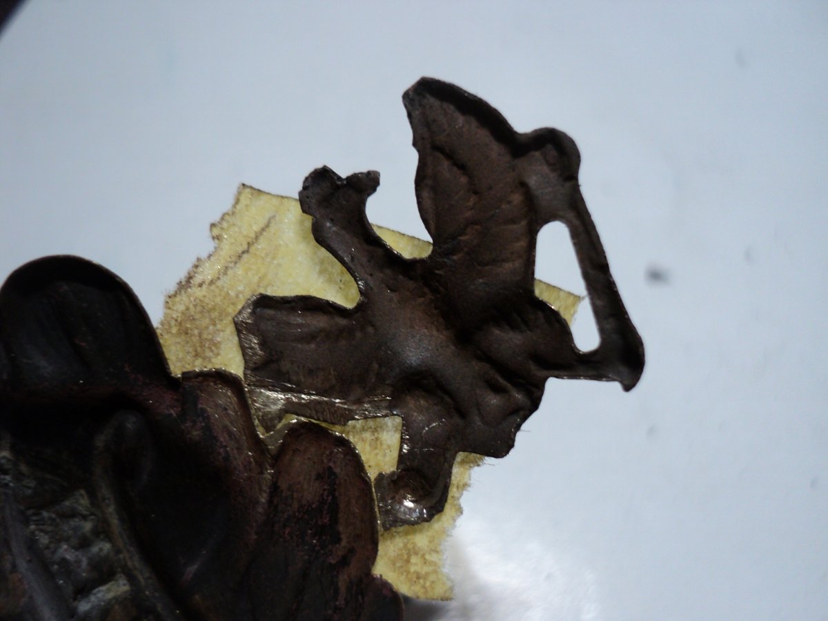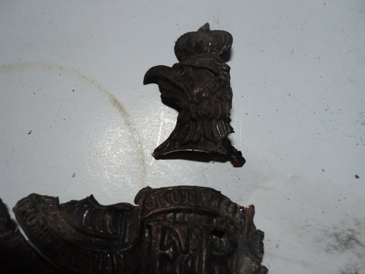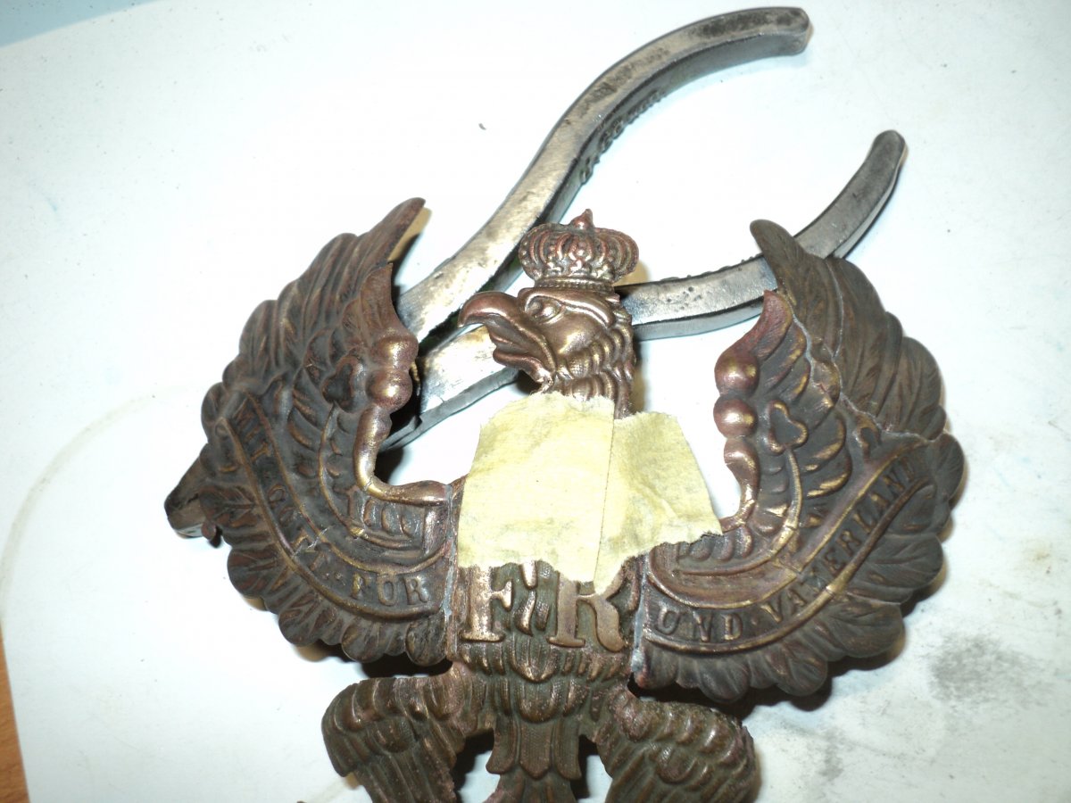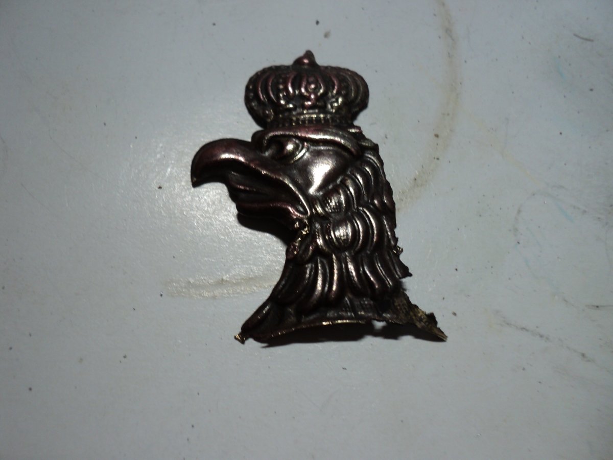 Восстановил одного орла. Прикупил "суповой набор" из остатков 3-х орлов и ободка козырька, но козырек большой и на этот пикель не подходит, будет ставиться на другой. Осмотрев все детали и складывая из них мозаику, было решено из 3-х сделать 2 и то неполных. Крыло спаяно из 3-х частей, голова и держава была отрезана с больш "убитого" орла, а также отрезана птичка скипетра из остатков крыла.